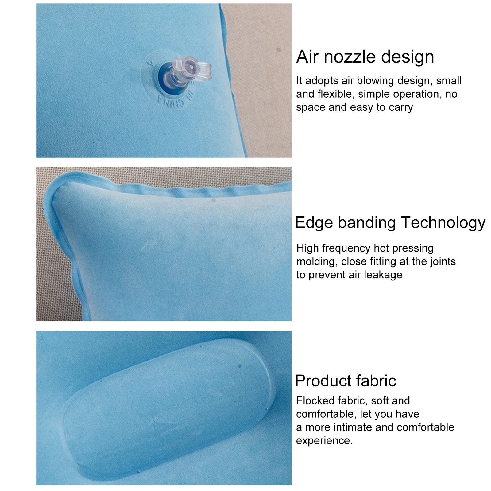 Надувание: прижмите плоское или укусывающее сопло и продувите его в течение нескольких секунд, надувайте всего за пару Дыханий и оставайтесь в открытом состоянии в течение нескольких дней; Дефляция: зажмите насадку и сдуйте ее нажатием на стол, а затем вы можете сложить подушку для обратной упаковки.