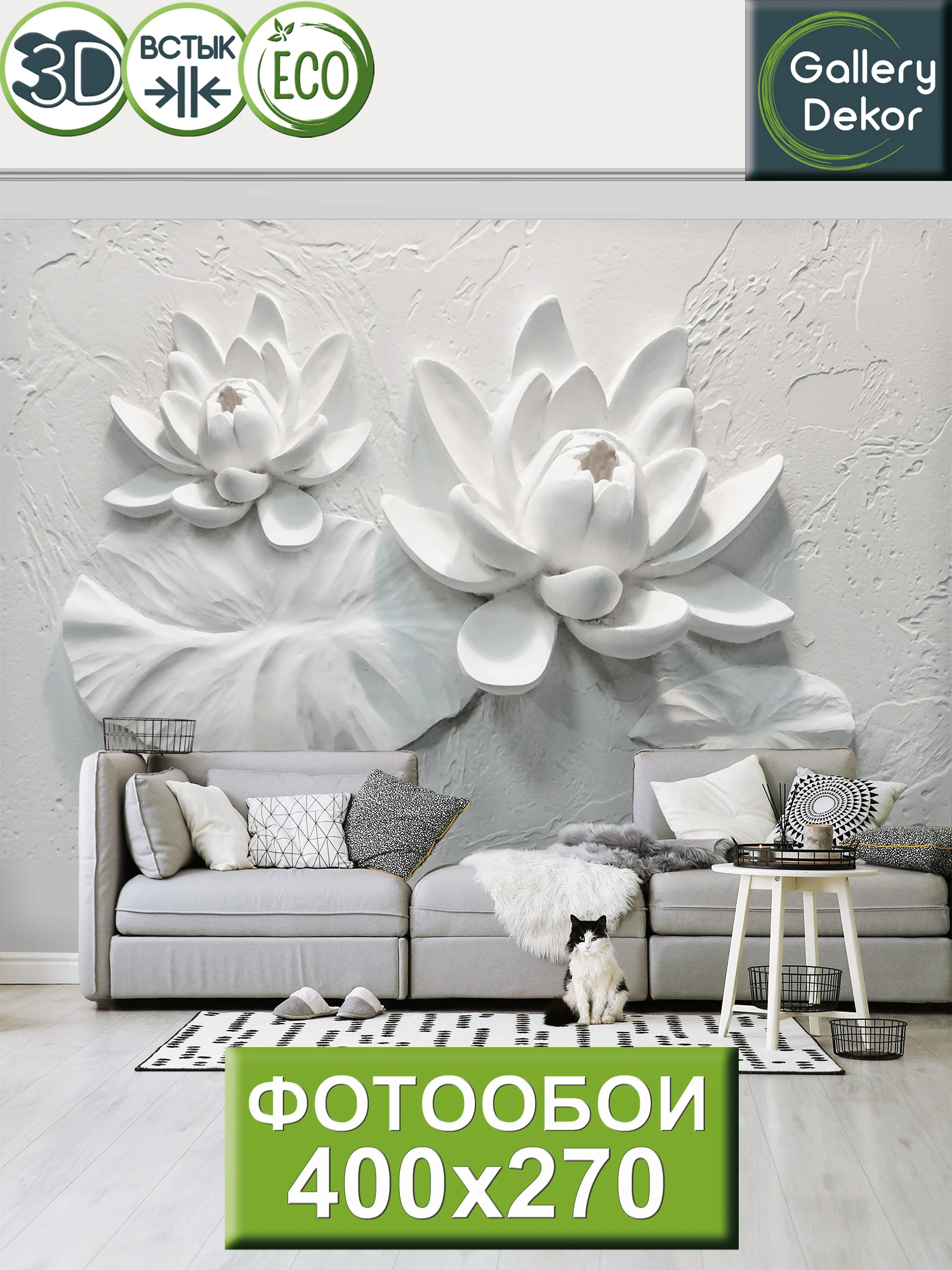 Фотообои Gallery Dekor 3D на стену флизелиновые лотос барельеф цветы белые