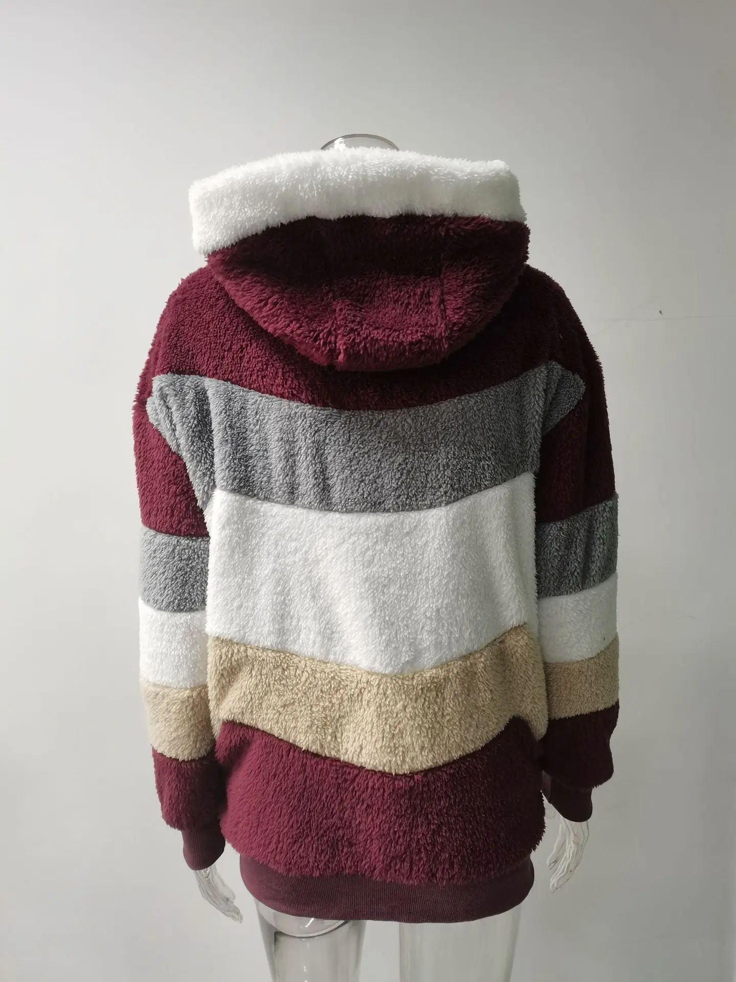 Женское Новое Стильное свободное плюшевое многоцветное пальто с кап...