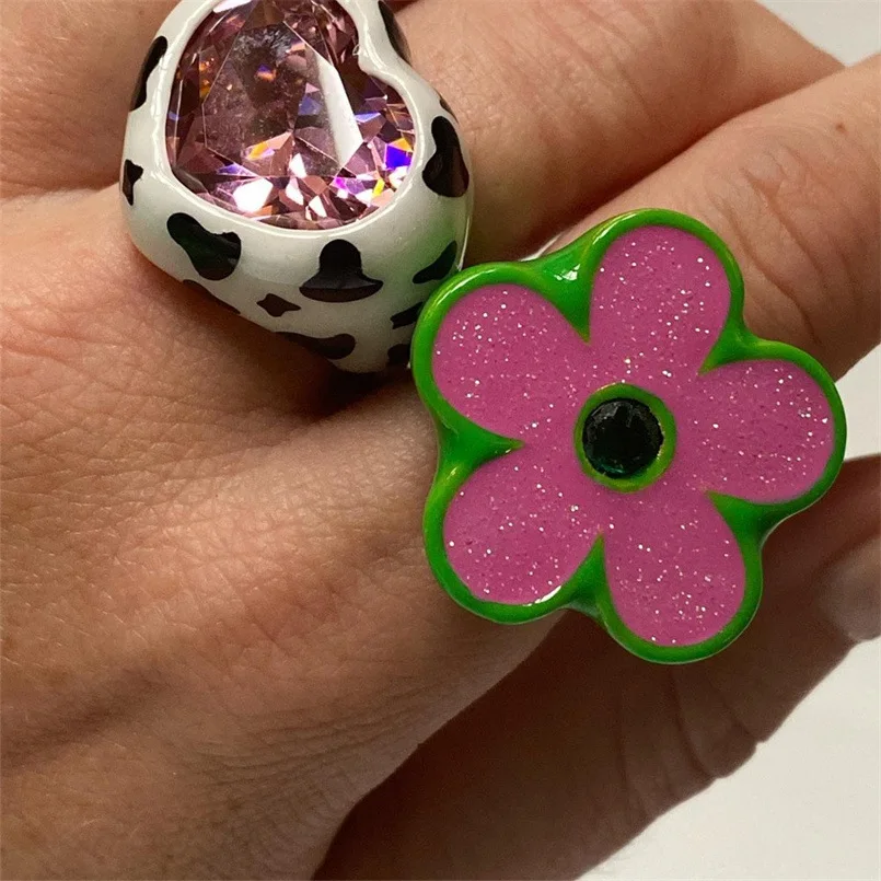 Яркие блестящие эмалевые кольца в форме цветка Y2K, модное большое ...