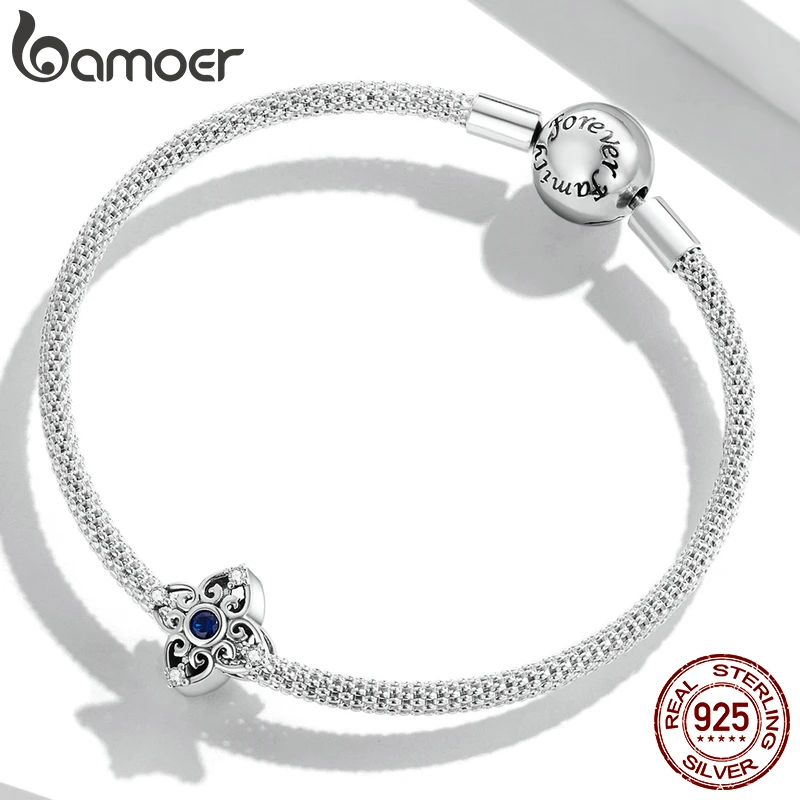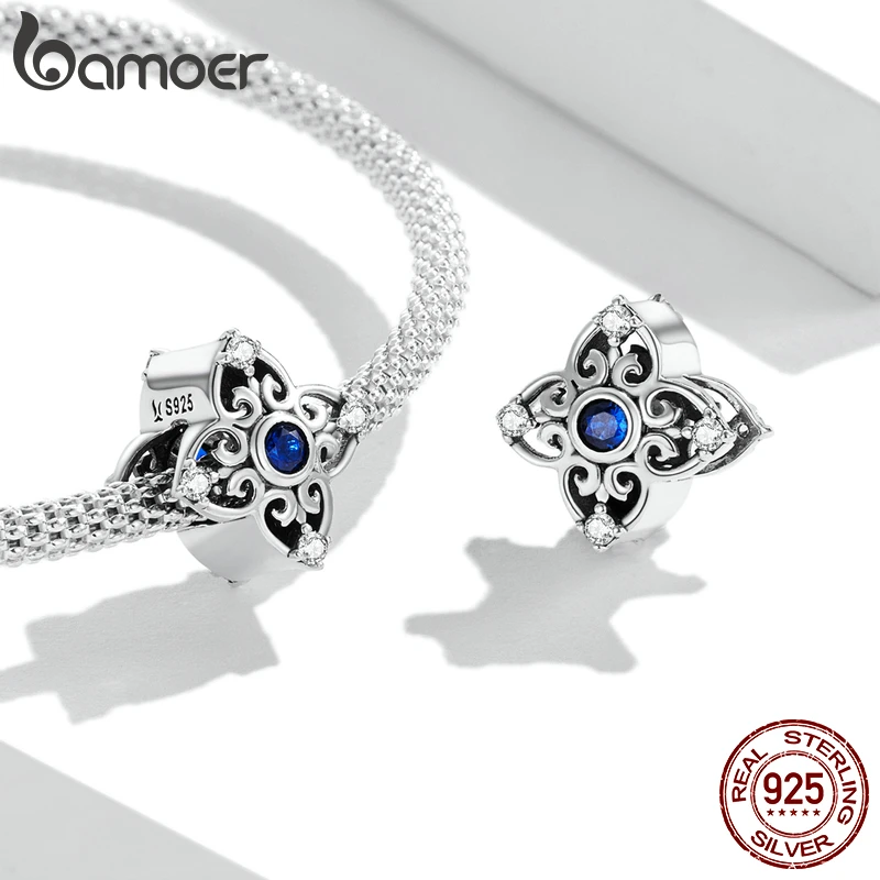 Bamoer винтажный узор полые амулеты для основного браслета подлинное серебро с голубым камнем 925 пробы ретро металлические бусины ювелирные украшения