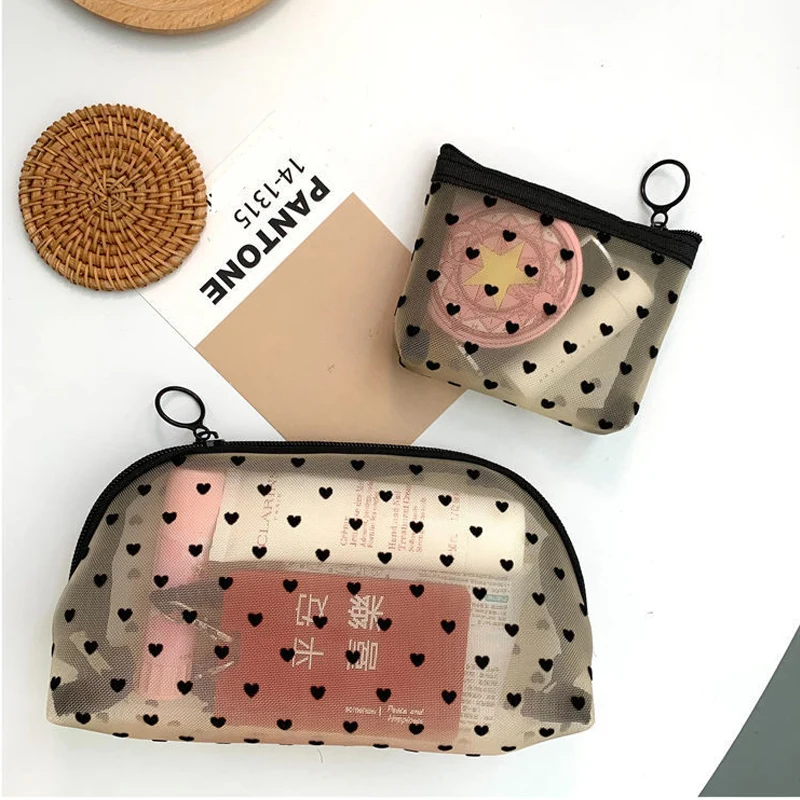 Модные сетчатые косметички, чехол, держатель, удобный для переноски прозрачный чехол на молнии с черным сердцем, чехол для карандашей