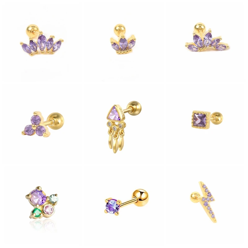 925 пробы Серебряная коллекция фиолетовых циркониевых серьги для пирсинга корона цветок молния квадратные треугольные хрустальные шпильки для ушей