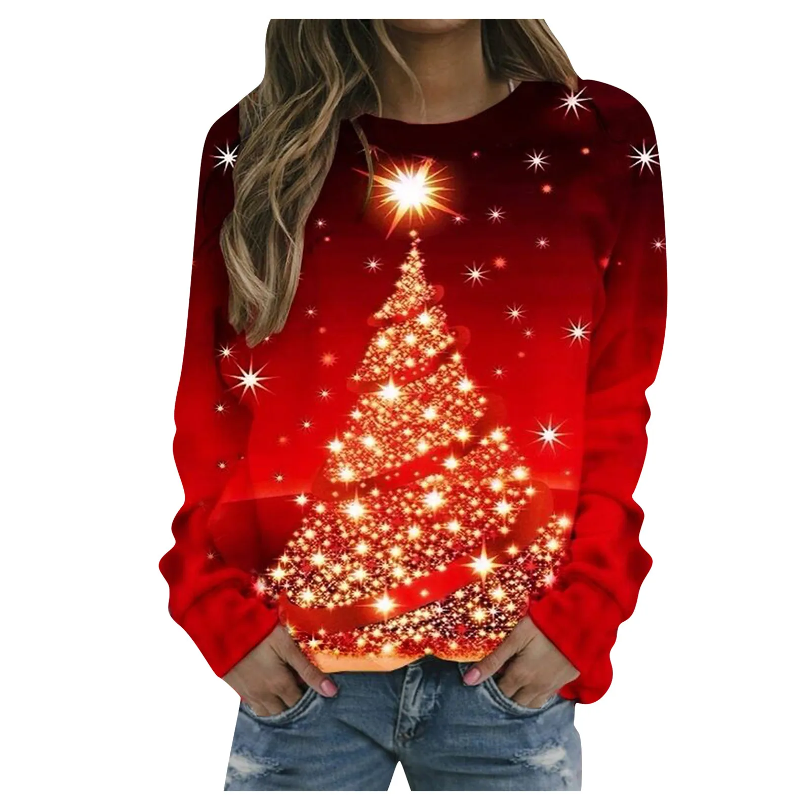 Женская одежда, свитшоты, винтажные толстовки с принтом рождественской елки, топы с длинным рукавом и круглым вырезом, свитшоты, женские блузы
