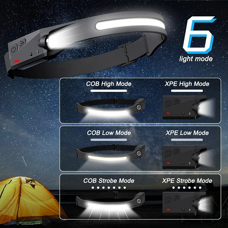 Головной Светодиодный фонарь с датчиком движения, COB со встроенным аккумулятором, зарядка через USB, светильник для кемпинга