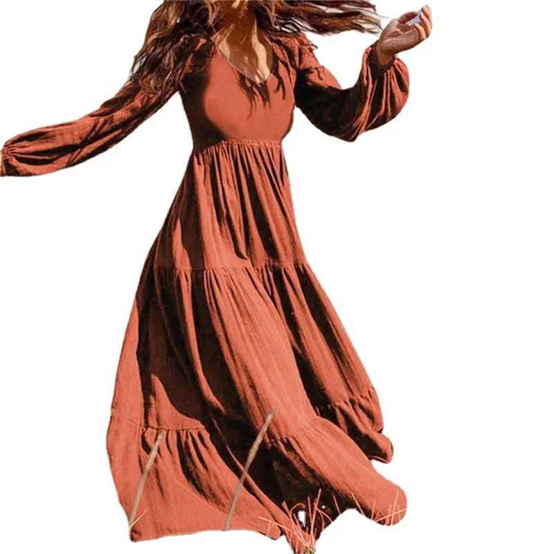 Женское платье-туника с рюшами, повседневное однотонное платье-макси с рукавами-фонариками, Осенний Сарафан