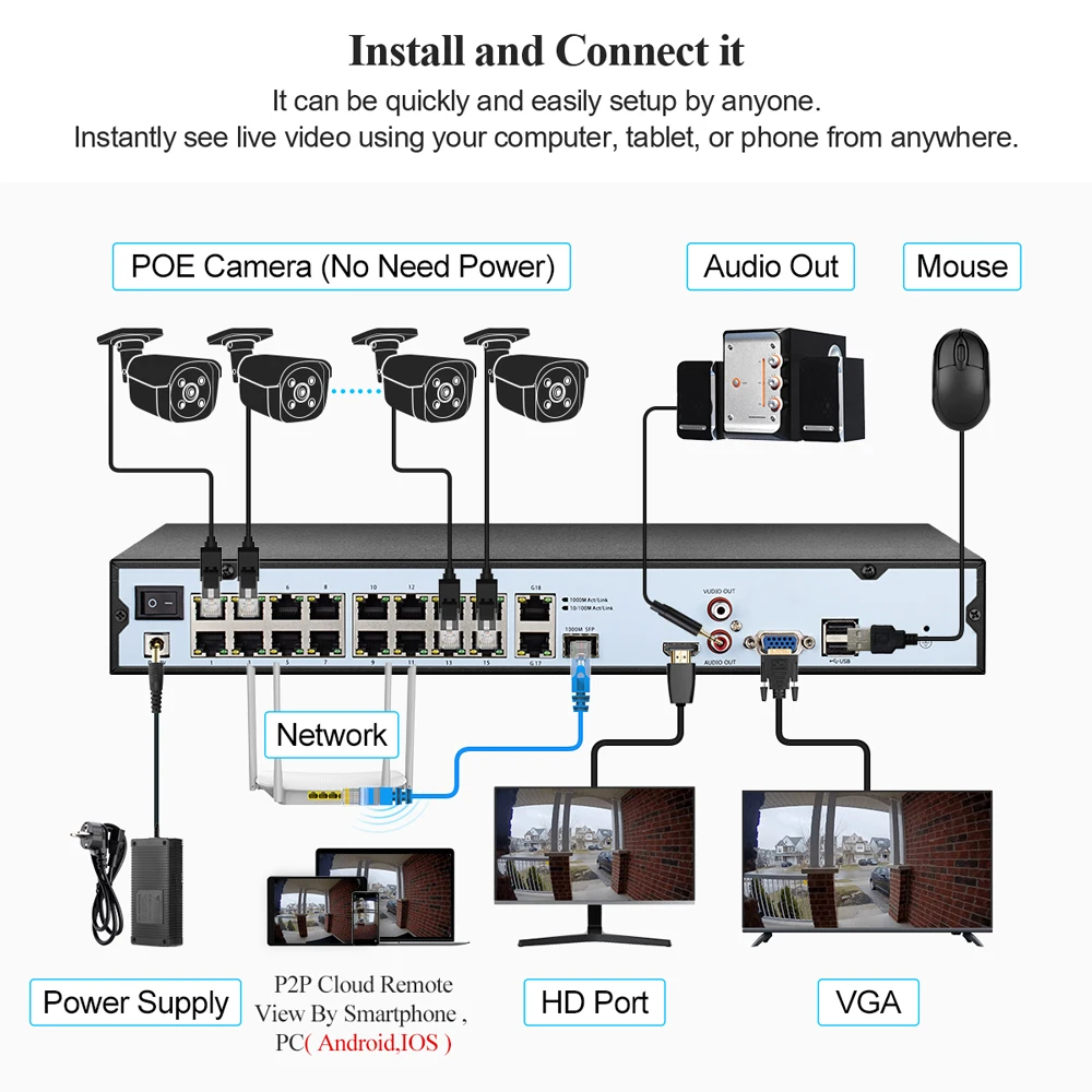 * Поддержка 2MP 3MP 4MP 5MP 4K дисплей* Plug & Play, легко установить* Поддержка многоэкранного дисплея и воспроизведения* Поддержка поиска, воспроизведения и резервного копирования по событию* Регистрация лица/движения, уведомление по электронной почте* Максимальная Поддержка жесткого диска 8 ТБ (не входит в комплект)* Поддержка работы с сторонними вечерние ip-камеры* Мощность POE поддерживает 16 шт. 80-100 метров RJ45 кабель* Поддержка удаленного доступа телефона через приложение XMeye* Язык в наличии: голландский, английский, китайский, французский, немецкий, итальянский, арабский, португальский, русский, испанский, тайский и т. Д.
