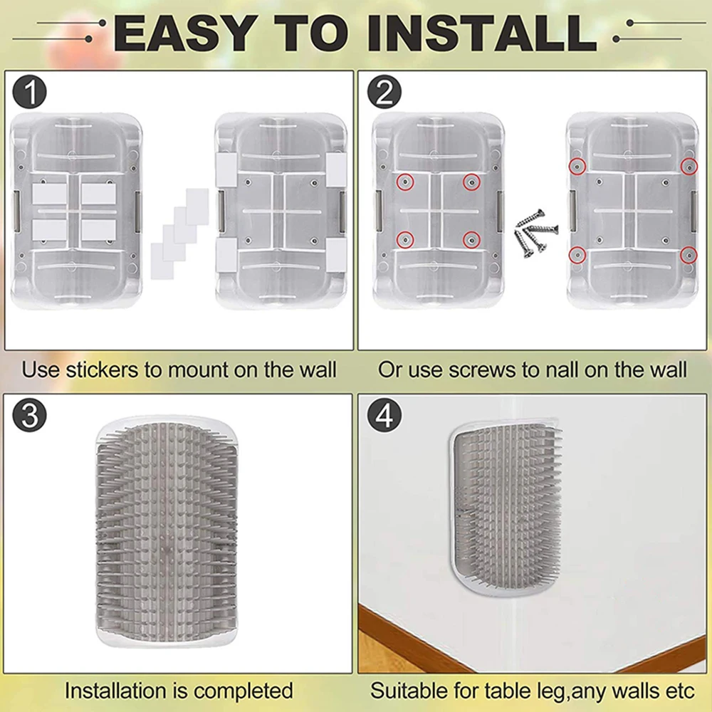 3. Легко установить, наша кошачья угловая щетка подходит для почти всех углов стен, ножек стола и углов шкафа. Его можно легко установить на плоскую стену или угловую поверхность с помощью винтов (опционально) или ленты, включенной в посылка.