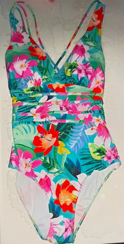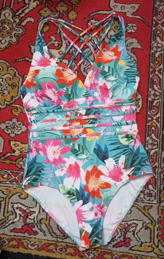 Стильный купальник Цвет-синий 02 Материал-85% полиэстер и 15% спандекс Размер на мне Л на рост 170см,бюст 89см,бедра 96см сидит четко по размеру и по росту. Красивый принт, хорошо прошито внутри и снаружи. Есть пуш ап,но его можно снять. Сзади на спинке перекресток. Очень хорошее качество, доставка 10 дней Новой в Украину. Рекомендую!