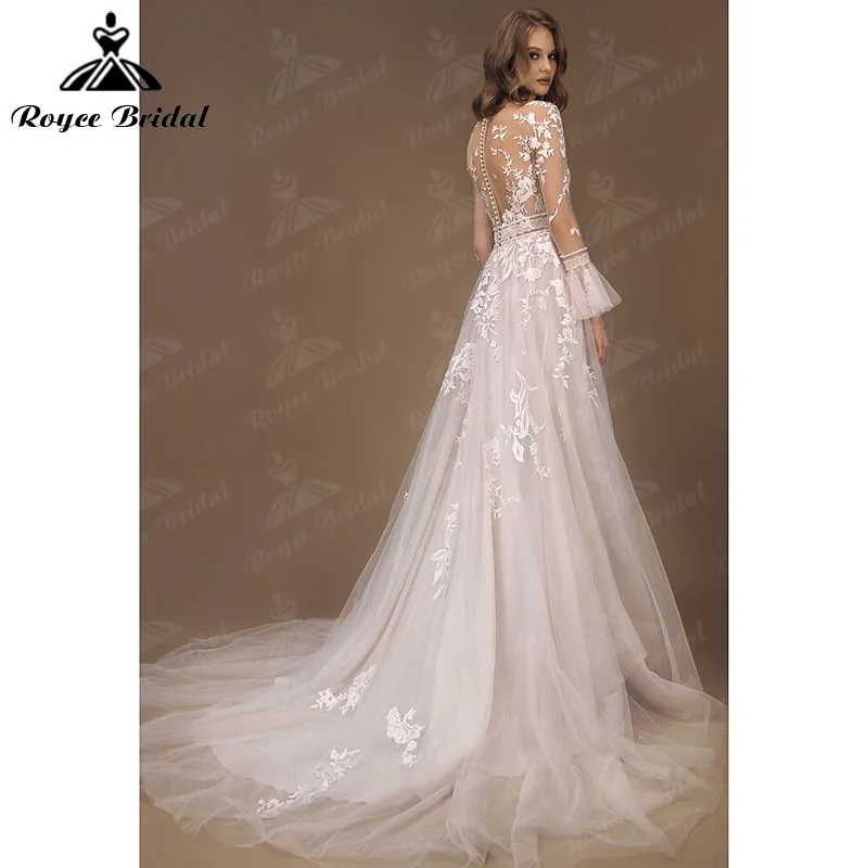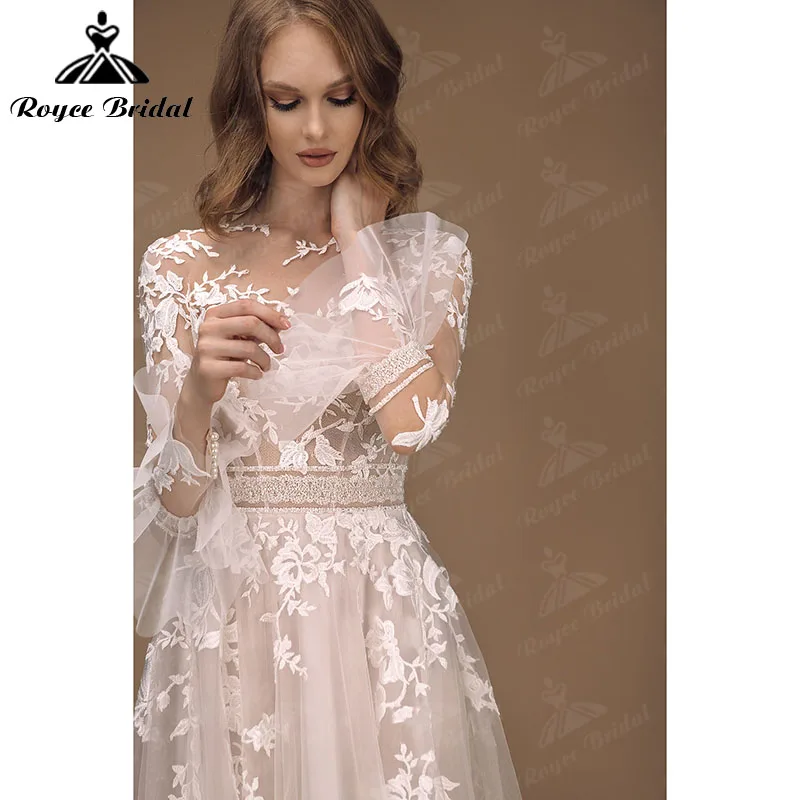 Элегантное пляжное богемное свадебное платье А-силуэта с длинным Расклешенным рукавом и открытой спиной, кружевное блестящее платье с круглым вырезом Roycebridal 2022
