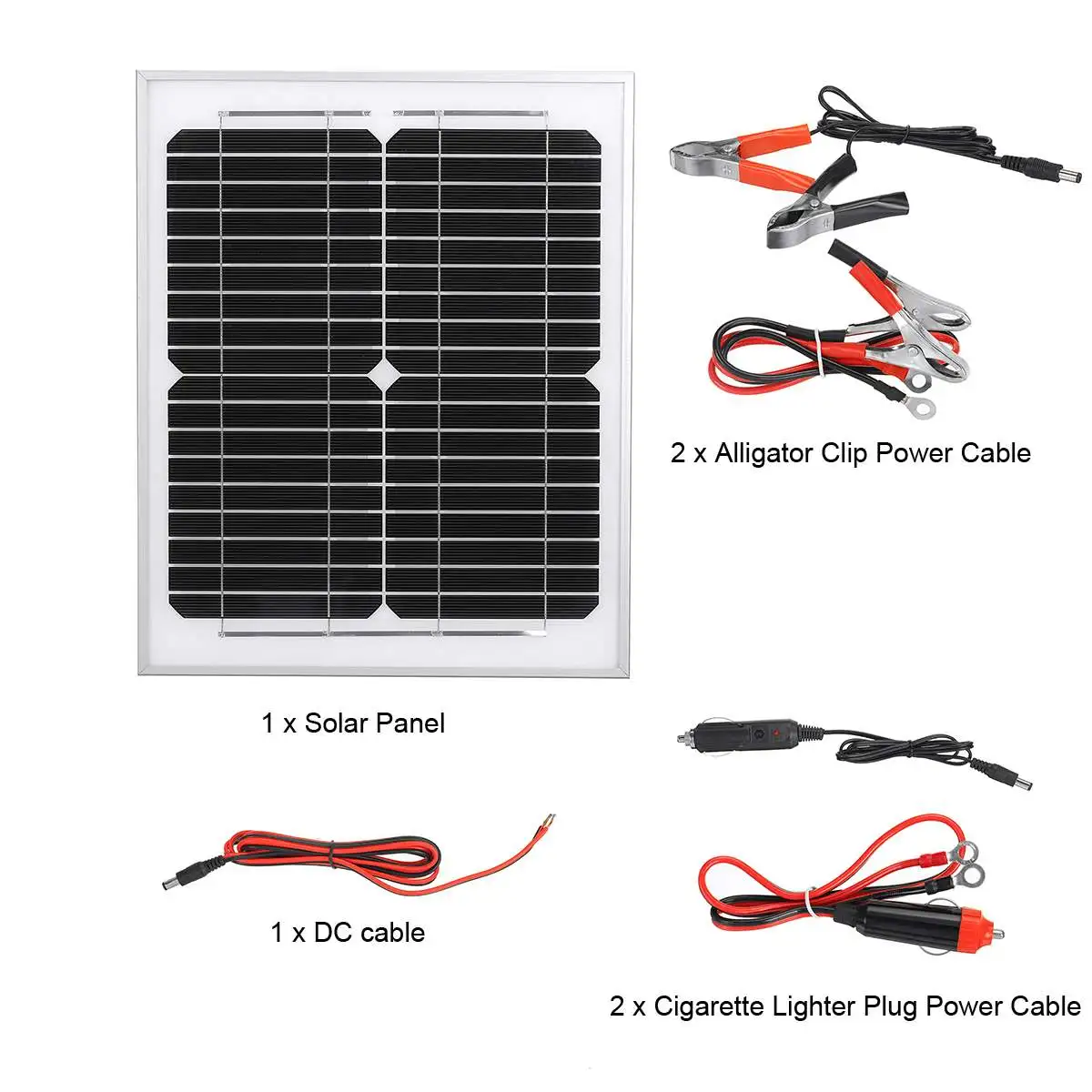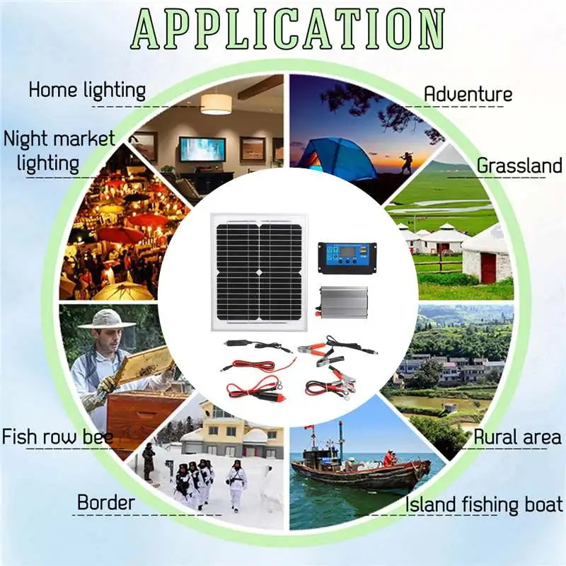 Особенности:-Прочная и прочная конструкция.-Высокая Конвертация для непрерывного источника питания до тех пор, пока есть солнце.-Портативный дизайн подходит для путешествий, кемпинга, верховой езды и любых видов активного отдыха.-Генерация энергии RV, система генерации кислорода в аквариуме, домашняя система солнечной энергии переменного тока.-Экологически чистый и не загрязняет окружающую среду, он реализует Преобразование энергии от солнечной энергии к электрической энергии.-Широкий спектр применений, его можно использовать во многих местах, таких как автомобили, небольшие приборы и т. д.-Солнечная панель-это устройство, которое преобразует прямое или Непрямое солнечное излучение в электрическую энергию путем поглощения солнечного света. По сравнению с обычными батареями и перезаряжаемыми батареями, солнечные панели энергосберегающие и экологически чистые.-Подходит для активного отдыха, чрезвычайных ситуаций и работы на открытом воздухе.Характеристики:# Солнечная панельМатериал панели солнечных батарей: поликремнийВыходной порт: USB + DCНапряжение: 5 В/12 ВЦвет: черный# КонтроллерНапряжение батареи: 12 В/24 В АвтоМаксимальный Солнечный Вход: 12 В аккумулятор. Самый высокий 23 в; 24 В аккумулятор, когда самый высокий 46 вПоплавковый заряд: 14,4 V defol, регулируемыйОстановка разряда: 10,7 В (дефол, регулируемый)Разряда Повторное подключение: 12,6 V(defaul, регулируемый)Зарядка Повторное подключение: 13,2 VНапряжение под открытым небом светильник: питание от солнечной энергии panel8V (светильник с задержкой)Напряжение близкого светильник: солнечная панель 8 в (светильник с задержкой выключения)Напряжение на выходе USB: 2 way напряжение на выходе USB, 5 В/2 5A (макс)Самостоятельное использование: <10 мАРабочая температура: -35 ~ + 60C# Инвертор