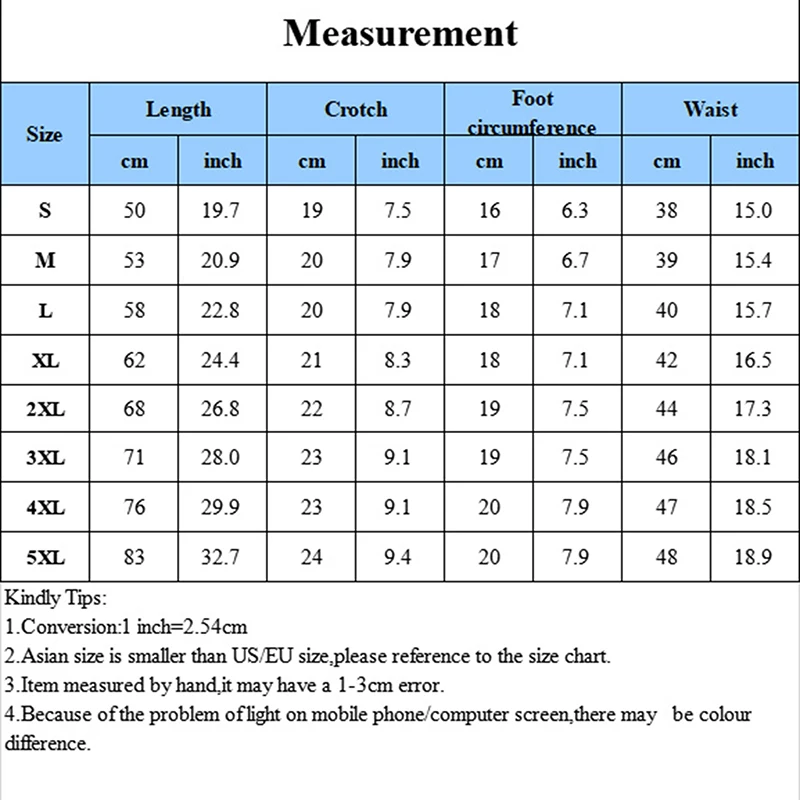 Размер: S.M.L.XL.2XL.3XL.4XL.5XLS: Длина брюк: 50 см, глубина шагового шва: 19 см, обхват стопы: 16 см, обхват талии 38 смM: Длина брюк: 53 см, глубина шагового шва: 20 см, обхват стопы: 17 см, обхват талии 39 смL: Длина брюк: 58 см, глубина шагового шва: 20 см, обхват стопы: 18 см, обхват талии 40 смXL: Длина брюк: 62 см, глубина шагового шва: 21 см, обхват стопы: 18 см, обхват талии 42 см2XL: Длина брюк: 68 см, глубина шагового шва: 22 см, обхват стопы: 19 см, обхват талии 44 см3XL: Длина брюк: 71 см, глубина шагового шва: 23 см, обхват стопы: 19 см, обхват талии 46 см4XL: Длина брюк: 76 см, глубина шагового шва: 23 см, обхват стопы: 20 см, обхват талии 47 см5XL: Длина брюк: 83 см, глубина шагового шва: 24 см, обхват стопы: 20 см, обхват талии 48 см