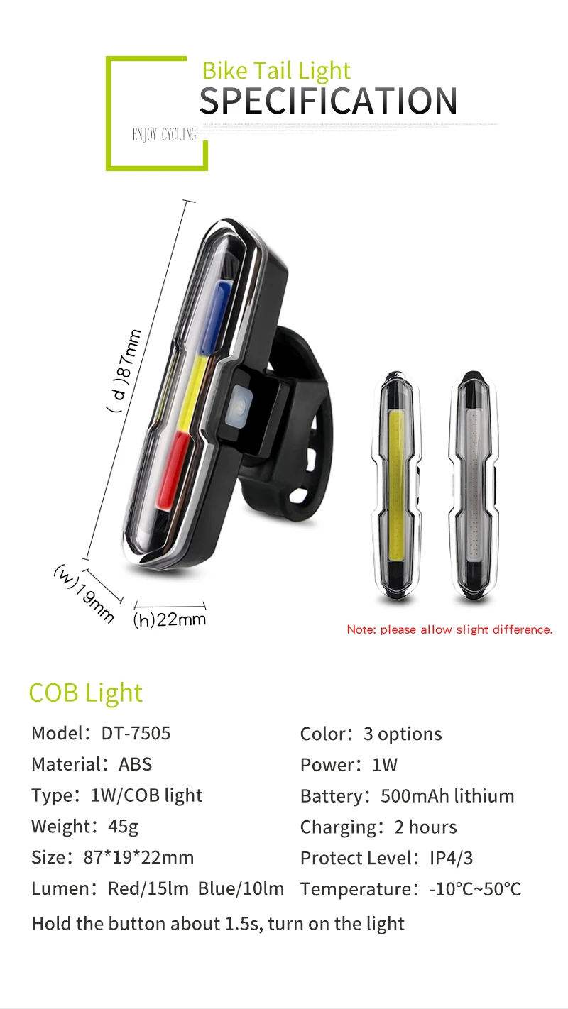 * Светильник источник света: 1 Вт бескорпусный чип (COB) большой мощности светильник* Источник питания: литий-ионный аккумулятор USB и 500 мАч* Яркость: Красный светильник (15 лм), синий светильник (10 лм)* Зарядка: около 2 часов для полной зарядки, хватает на 4-6 часов* Вес нетто: 45 г* Уровень защиты: IP43* Диапазон температур: -10 ℃ ~ 50 ℃
