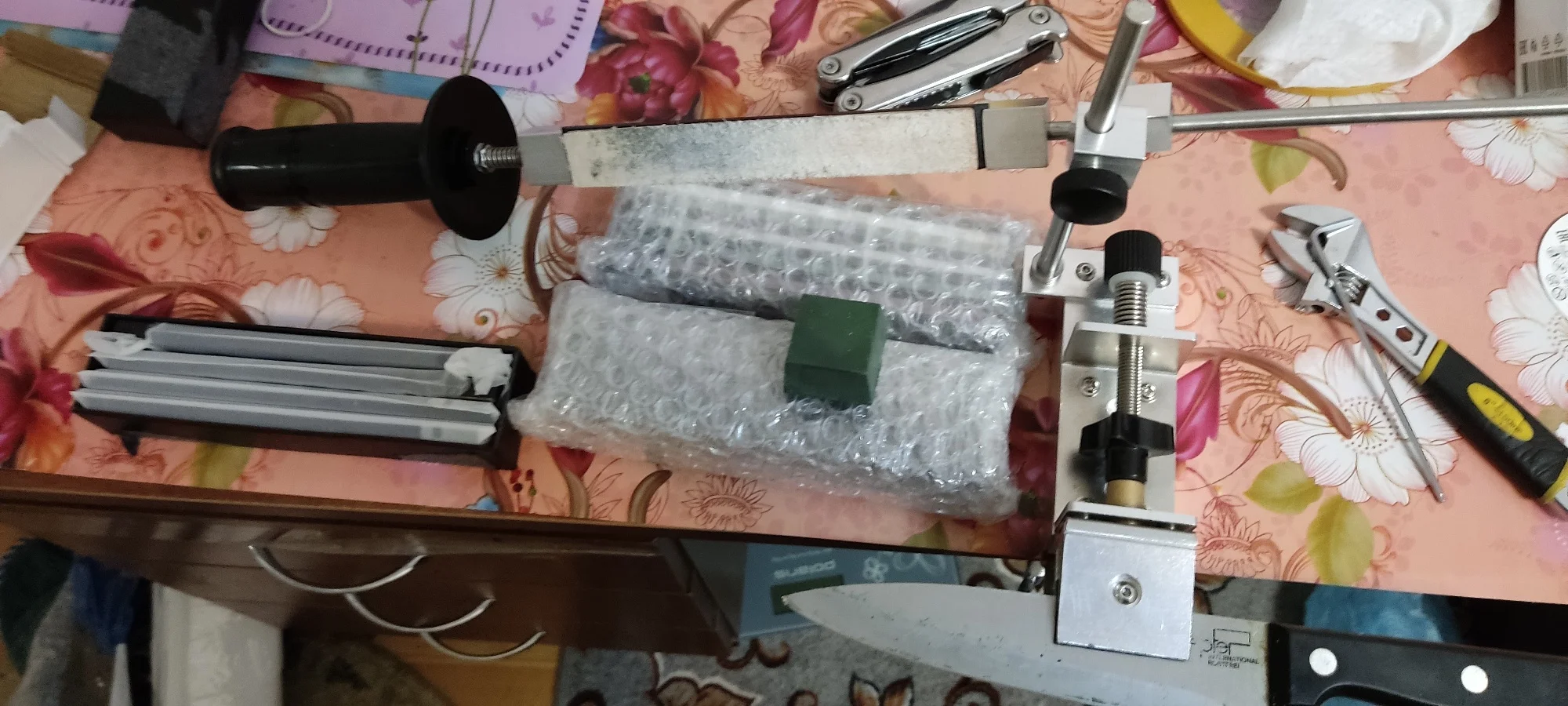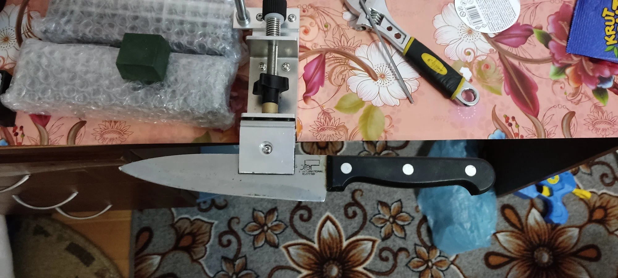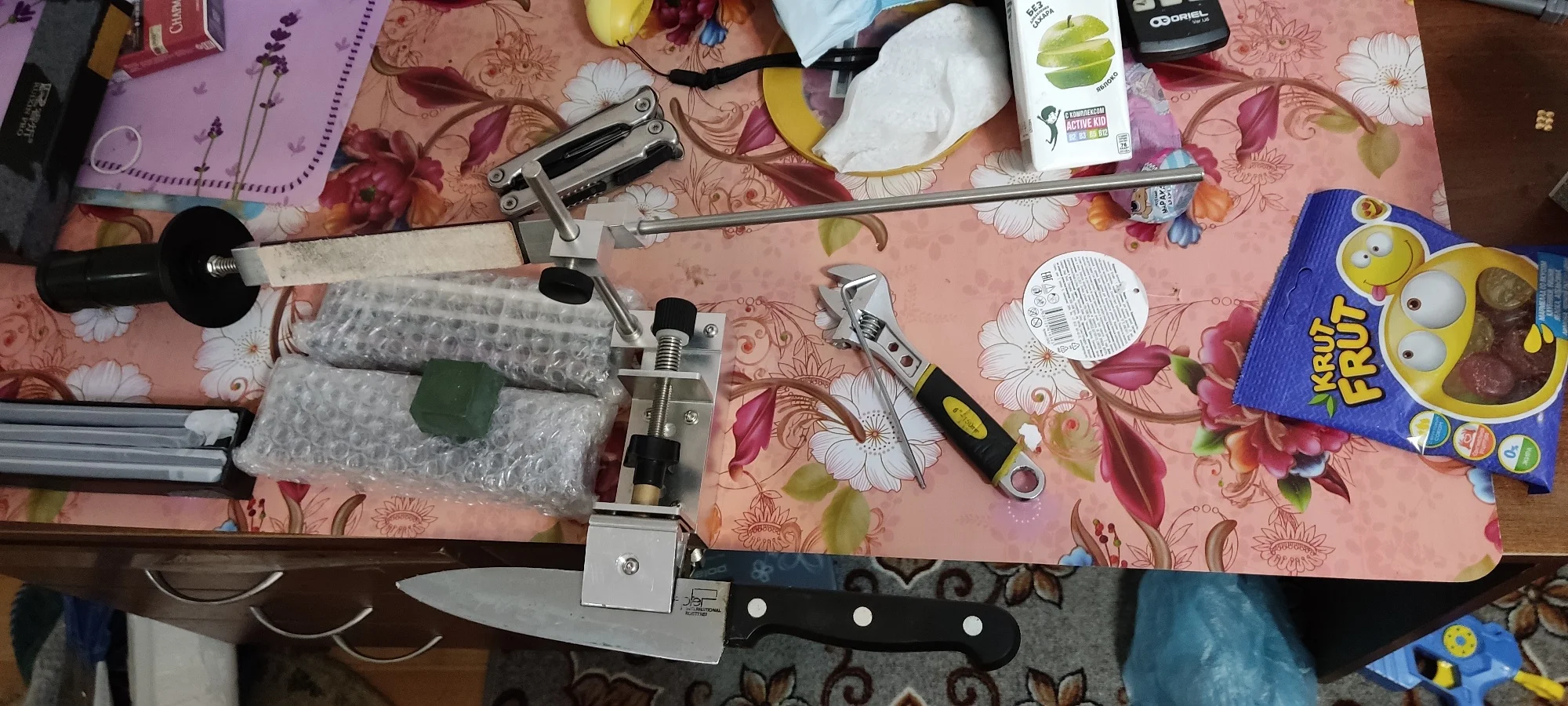 хорошая точилка, но для тонких и узких кухонных ножей желательно чтобы было 2 точки крепления. Продавец в качестве подарка положил ещё много заточных камней, за что ему большое спасибо и успехов в бизнесе.