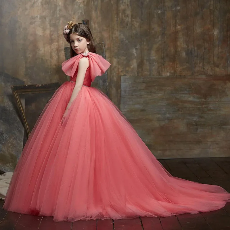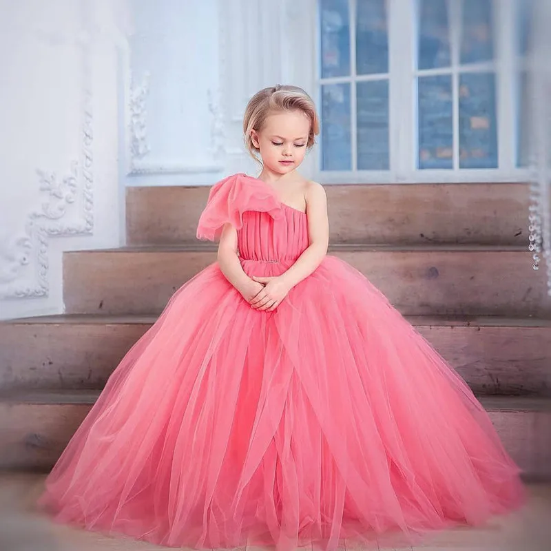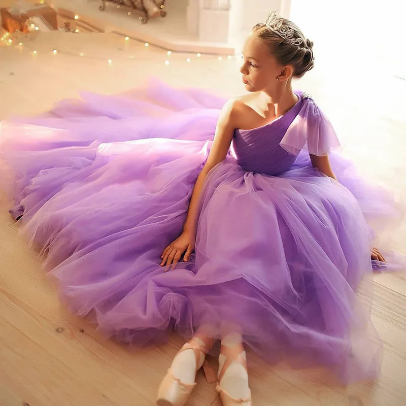 Фиолетовые розовые платья для девочек с цветами, фатиновые пышные платья для первого причастия на одно плечо, детское платье на день рождения с узлом