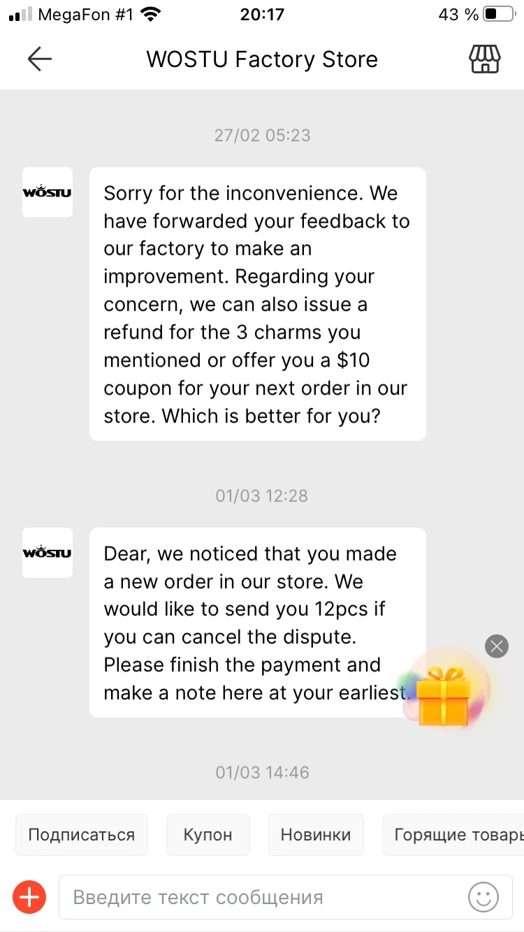 Продавец, конечно, ведёт себя не честно. Заказала 10 шармов. 3 из них качество не понравилось, открыла спор. Продавец попросил спор закрыть, предложив в следующий мой заказ (ещё на 10 шт) 2 в подарок. Спор закрыла. В итоге пришло 10 штук, никаких 2-ух в подарок, 2 из моих 10 качество не устраивает. Также не доложил 5 мешочков, из 10 только половину прислал. Открыла спор, не признаёт. Не могу вернуть деньги за 2 не понравившиеся и 5 мешочков. Пришлось 5 докупать за свои деньги.