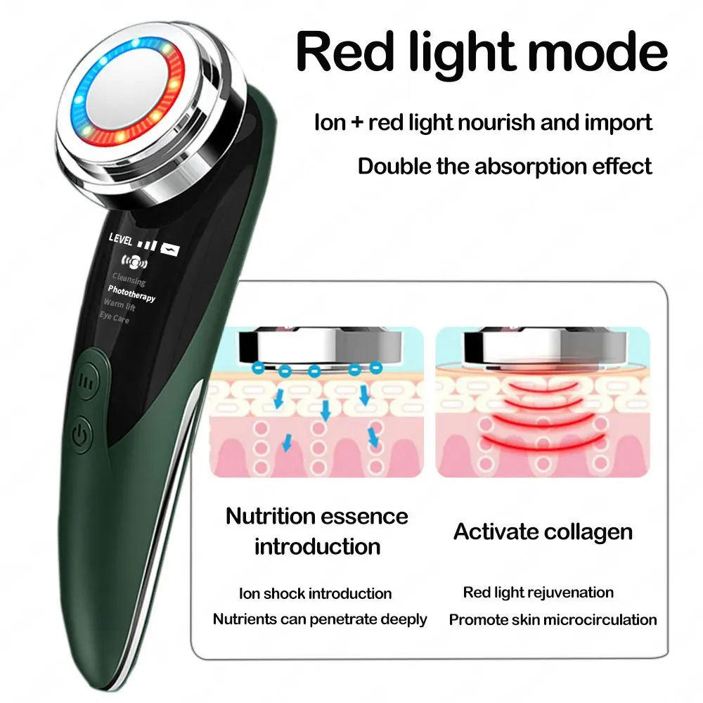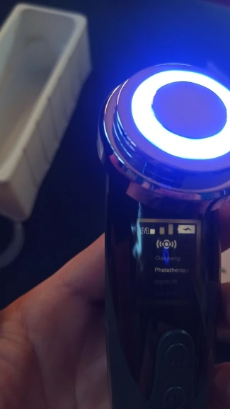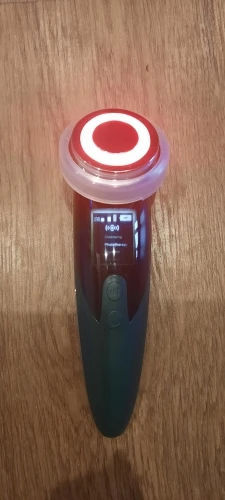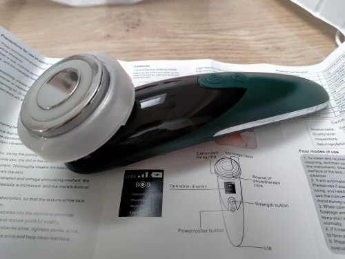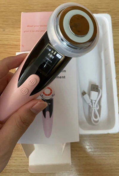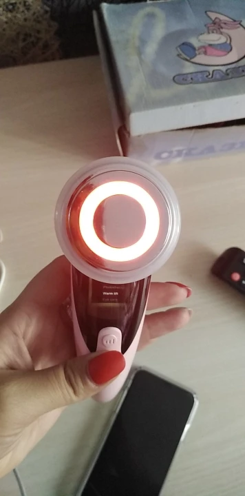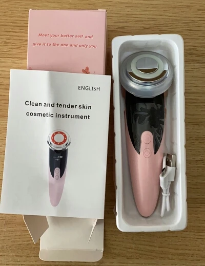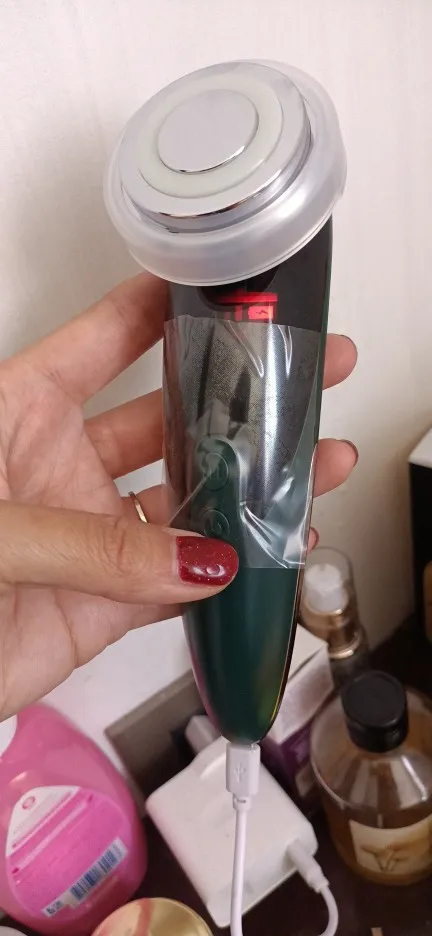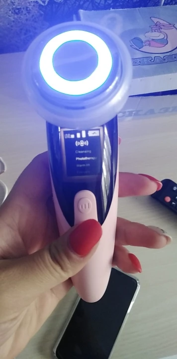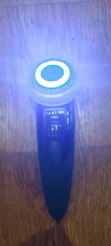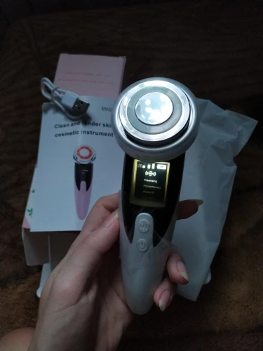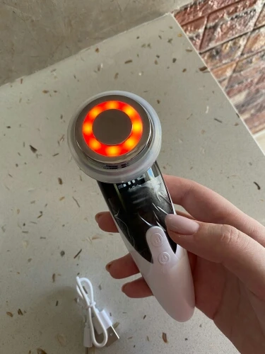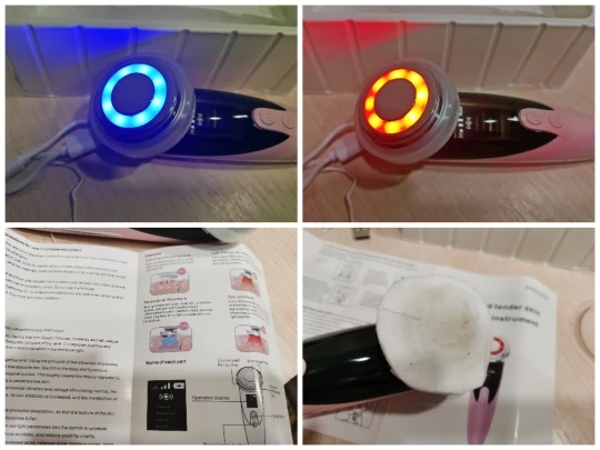 Фото 1. Товар прибыл в закрытой упаковке, которая предварительно была запакована в защитную пленку. Ничего не повредилось! :) Фото 2. Аппарат и шнур для зарядки. Фото 3. Аппарат в рабочем режиме - фототерапия (красный свет) Фото 4. Аппарат в рабочем режиме фототерапия (синий свет). Фото 5. Аппарат в упаковке. К аппарату прилагалась инструкция на английском языке. :) Все режимы работают, аппарат вибрирует, достаточно мягко, нет ощущения раздражения от вибрации. Тепловой эффект присутствует на всех режимах. У аппарата 4 режима использования. Эффективность аппарата можно заметить на минимальных мимических морщинках. После примирения, они разглаживаются. Это приятно удивило :))) Эффективность проникновения косметических