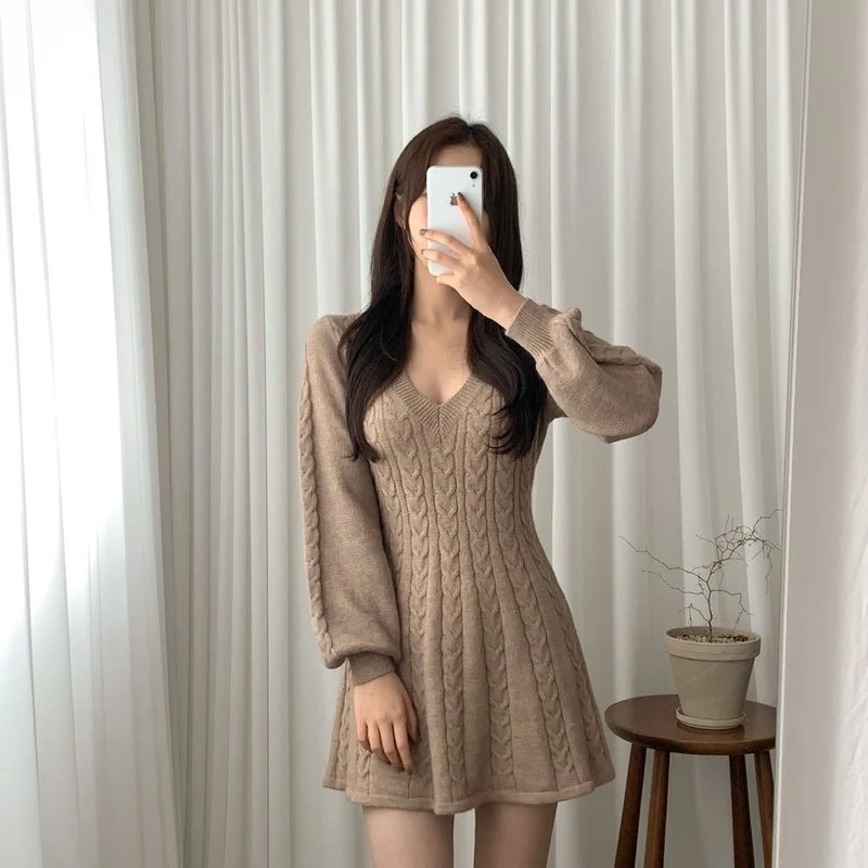 Осеннее вязаное мини-платье-свитер, женские платья-свитеры в Корейс...