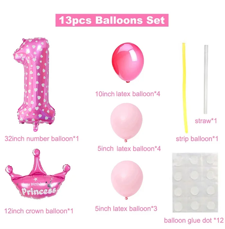 13 шт. набор воздушных шаров:1 шт. 32 дюймов номер воздушный шар из фольги1 шт 12 дюймов Корона фольги воздушный шар4 шт 10 дюймов латексные шары7 шт. 5 дюймов Макарон воздушные шарыАксессуары:1 шт полоса воздушный шар1 шт соломы12 шт воздушный шар Клей точка