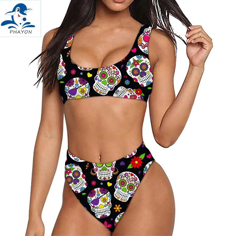 Летний купальный костюм PHAYON для девочек-подростков, новинка, крутой спортивный комплект бикини с принтом в виде сахарного черепа из 2 предметов, эластичная быстросохнущая одежда для плавания, монокини