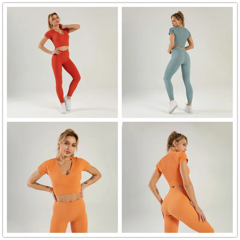 Бесшовный Женский комплект для йоги, тренировочные рубашки, спортивные штаны, бюстгальтер, одежда для тренажерного зала, короткий топ с высокой талией, леггинсы для бега, спортивный комплект