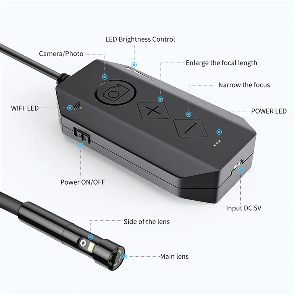● Типы эндоскопов: эндоскоп WIFI● Аккумулятор: 2600 мАч● Разрешение камеры: двойной объектив 1080P/один объектив● Объектив камеры: 4X зум● Диаметр объектива камеры: 8 мм● Длина кабеля: 3,5 м, 5 м, 10 м опционально● Стиль Кабеля: жесткая трубка● Светильник: регулируемый светодиодный светильник● Уровень водонепроницаемости: IP67● Угол обзора: 70 °● Система поддержки: для ios iphone/Android телефонов, планшетов, ПК● Размер датчика: 1/5 дюйма● Частота кадров: 30 кадров в секунду● Источник питания: 5 В постоянного тока через USB● Формат фото: MJPEG● Формат видео: MP4