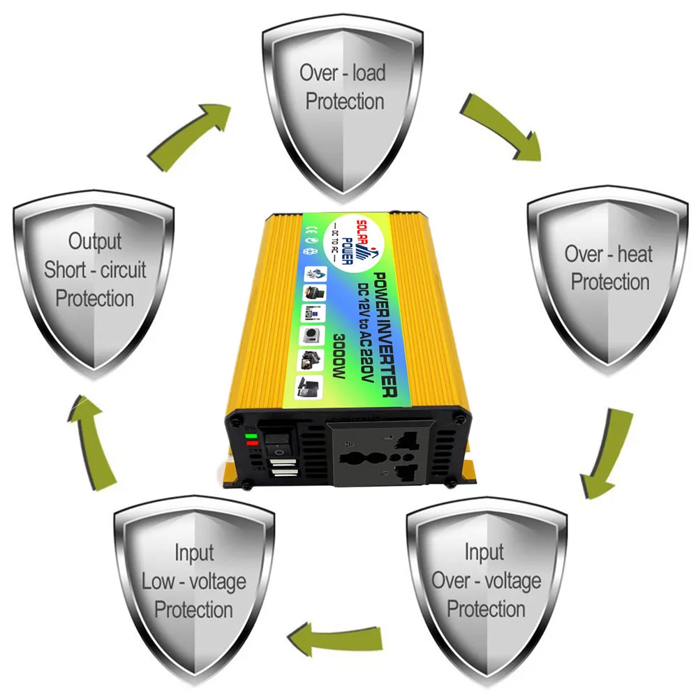 Когда инвертор работает нормально, зеленый светодиодный светильник работает и говорит вам, что он работает хорошо, но когда он находится на состоянии защиты, например, низкое напряжение, высокое напряжение, перегрев, или над нагрузкой, красный светодиодный светильник s будет светильник, и вам нужно выключить инвертор, И проверьте, какая функция защиты работает, и попробуйте решить ее, тогда инвертор может работать снова.