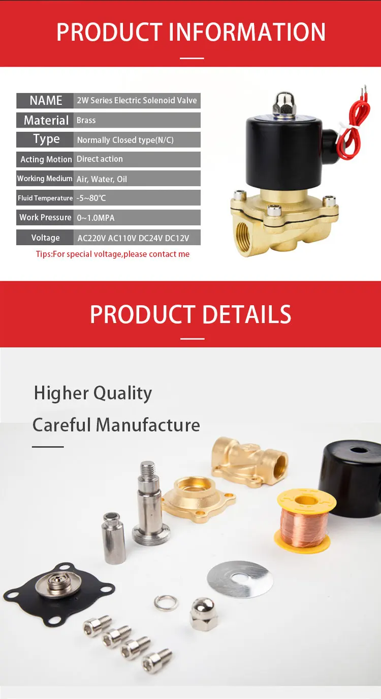 Описание товараНазвание: электромагнитный клапанМодель: 2W025-08,2W040-10,2W160-15,2W200-20,2W250-25Материал: латуньЦвет: черный + золотойНапряжение: AC220V AC110V DC24V DC 12VТип: Нормально закрытый тип (N/C)Действующее движение: прямое действиеФормат подключения: внутренняя резьбаДиаметр трубы: DN08(1/4 " ) DN10 (3/8") DN15(1/2 " ) DN20 (3/4") DN25(1 ").Номинальный диаметр: DN08 (2,5 мм) DN10(4 мм) DN15(16 мм) DN20(20 мм) DN25(25 мм)Температура жидкости: -5 ~ 80 ℃Рабочее давление: 0-10 кг/см 2;Класс защиты: IP6Материал уплотнения масла: NBRПорты: 1/4 "3/8" 1/2 "3/4" 1 "впускные и выпускные порты.Рабочая среда: воздух, вода, маслоОсобенности:-Двухпозиционный, односторонний, нормальный выключатель, магнитный соленоидный водяной клапан.-Высокое качество алюминиевого сплава гравитационного литья, жесткий и прочный, не КОРРОЗИОННЫЙ, продукт имеет направление воды на входе и выходе.-Может быть установлен под любым углом, но это хороший выбор, когда горизонтальная трубка держит вверх.-Легко заменяет сломанные клапаны для использования с трубопроводами в области применения воды, воздуха и дизельного газа.Примечание: Этот Соленоидный клапан не подходит для непрерывного открытия в течение 24 часов, или катушка может гореть!