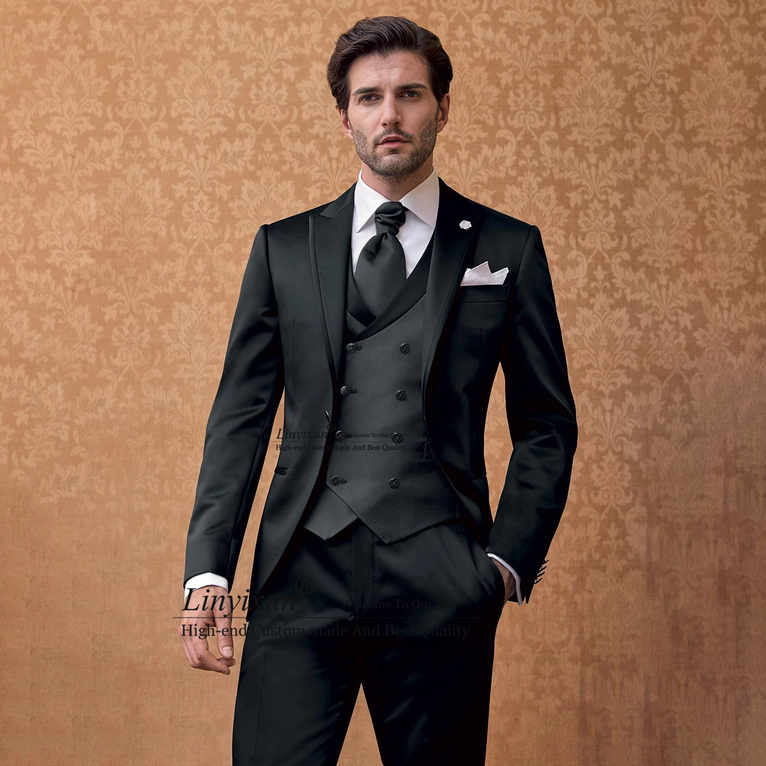 Классический черный мужской костюм, свадебный смокинг для жениха, приталенный деловой Блейзер, комплект из 3 предметов, пиджак, жилет, брюки, костюм для мужчин