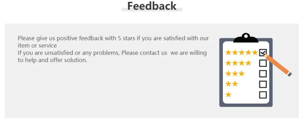 1. Если вы удовлетворены нашими продуктами и услугами, пожалуйста, оставьте положительный отзывы и 5 звезд. 2. Если вы не довольны нашими товарами, пожалуйста, свяжитесь с нами, прежде чем оставить негативный отзыв. Мы гарантируем, что мы 100% решим любую проблему для вас и сделаем вас удовлетворенными.