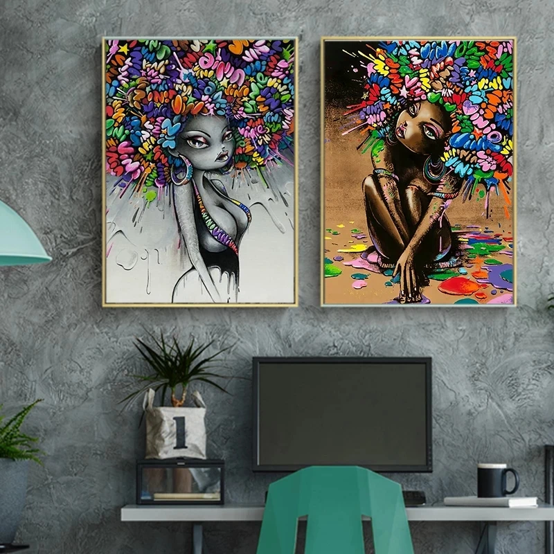 Абстрактные граффити АФРИКАНСКАЯ ДЕВУШКА с пушистыми волосами плакаты и искусство стены картины для декора гостиной
