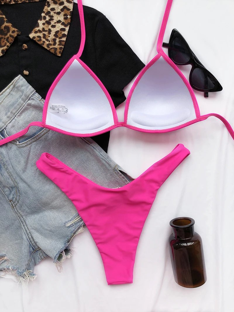 Соблазнительные бикини с эффектом пуш-ап, топ на бретелях, однотонный комплект бикини, Женский бразильский купальник с высоким вырезом, Женская пляжная одежда для плавания с низкой талией