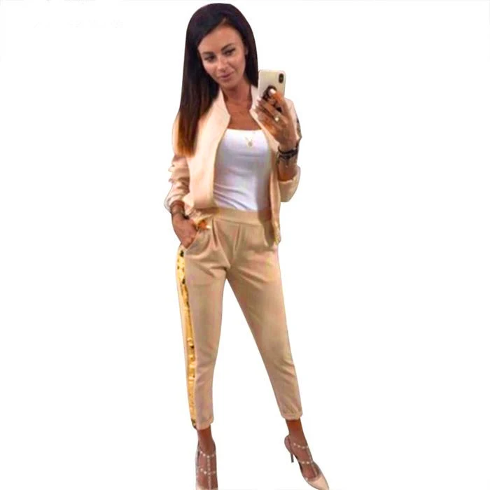 Женский спортивный костюм из двух предметов с блестками, повседневная куртка с длинным рукавом, свитшот, костюм на молнии, спортивный костюм для женщин