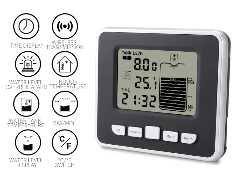 Вы можете установить его в верхней части резервуара для воды, счетчик может измерить точную температуру с помощью ультразвукового датчика.