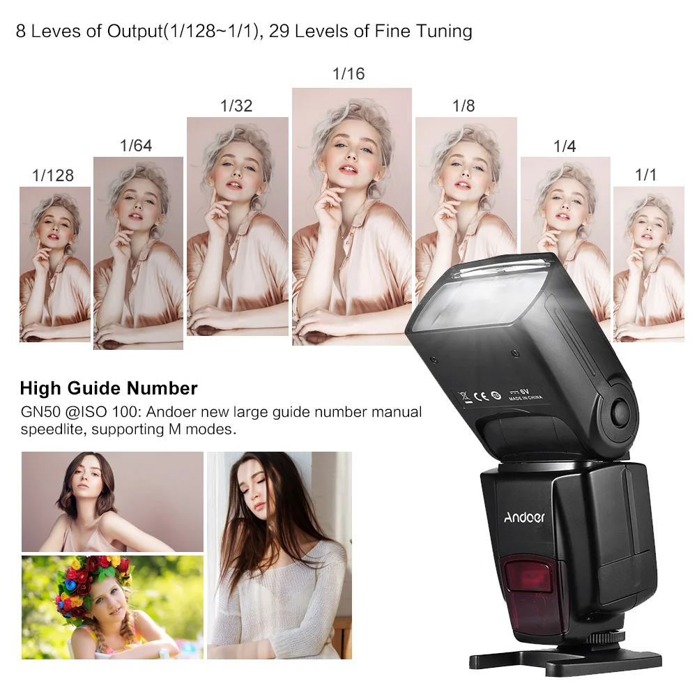 Особенности:GN50 @ ISO 100: новый большой направляющий номер ручной speedlite, Поддержка режимов M. Автоматически сохраните настройки тока.Высокочувствительный беспроводной датчик срабатывания делает режим S можно использовать в наружной среде и беспроводное расстояние срабатыванияОколо 100 м.Поддерживает функцию звуковой подсказки, различные звуки указывают на рабочие ситуации и помогают вам фокусироваться на съемке (Примечание: звук может быть закрыт).Супер скорость зарядки утилизируется: зарядка занимает всего 3 секунды после полной выходной мощности. Даже без новых аккумуляторов, вы можете получить скорость суперзарядки, которая требуется всего 4 ~ 5 секунд.Высокоскоростная непрерывная съемка: при уровне выхода 1/8 или ниже она может поддерживать высокоскоростную непрерывную съемку 8 кадров в секунду.Поставляется с дистанционным триггером вспышки, который можно управлять одной или несколькими вспышками одновременно.Характеристики:Бренд: AndoerМодель: AD-560 IVКонструкция цепи: изолированный биполярный транзистор (IGBT)Руководство №: 50 (ISO 100)Режим: режим M flash, режим S flash, беспроводной режимВертикальный угол вращения: -7 ~ 90 градусовУгол горизонтального вращения: 0 ~ 270 градусовИсточник питания Speedlite: 4 батарейки типа АА(Не входит в комплект)Триггер питания: 1 * CR2 литиевая батарея(Не входит в комплект)Время освещения: 100 ~ 1500 раз (при использовании щелочной батареи АА)Время рециркуляции: прибл. 3s (используется Щелочная ячейка @ AA)Цветовая температура: 5600kВремя вспышки: 1/200s ~ 1/20000sУправление вспышкой: 8 уровней управления выходом (1/128 ~ 1/1), 29 уровней тонкой настройкиВнешний интерфейс: горячий башмак, порт ПКБеспроводная дистанция запуска:Около 100 мВес изделия (без батареи): 320 г/11,3 унцийПримечание:Батарейки в комплект не входят.Эта speedlite является подчиненным блоком, и она не может использоваться в качестве главного блока для запуска других speedlite.Speedlite не совместим с CANON 1500D,3000D,200D II, 2000D, 4000D, Rebel T7, Rebel, KISS X90.