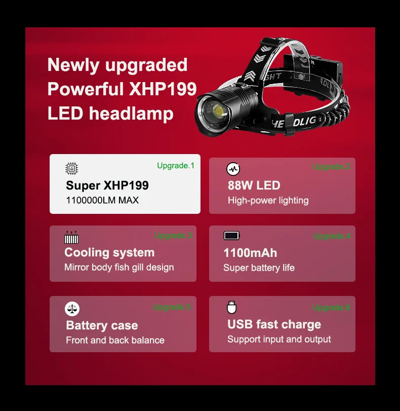 AliExpress обновленный яркий XHP199 светодиодный фонарь для охотыЭтот налобный фонарь super XHP199 является одним из самых ярких фар на AliExpress. Его яркость эквивалентна яркости трех фар XHP50.2. Индикатор питания на батарейном блоке фары, поэтому вы можете обратить внимание на мощность фары в любое время. Специальный красный и синий светильник предупредительный светильник-источник хорошо предупредит людей. Рекомендуется купить комплект с аккумулятором, который может значительно удовлетворить требования фары для модели аккумулятора и увеличить срок службы батареи. Хотя цена немного дорогая, яркость и качество отличные, спасибо за вашу поддержку.