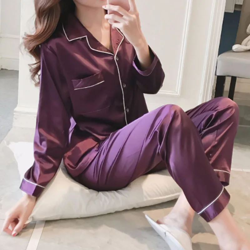 Пижама женская атласная, с длинным рукавом, Осень-зима, 2 шт.