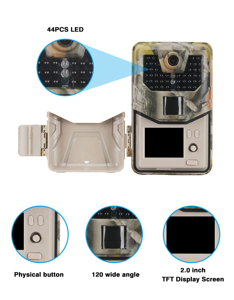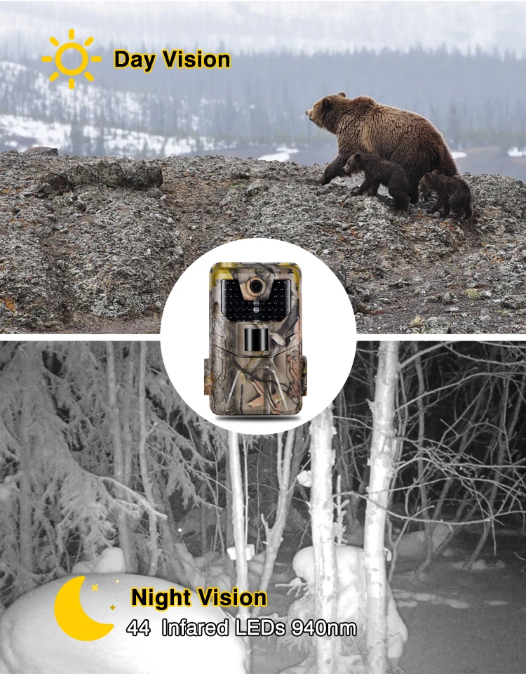 Отличная чувствительность и ночное видение с 3 PIR: Модернизированный 44 шт. без свечения светодиодов (без вспышки при съемке, не легко разоблачить ночью), струйное стекло и невидимая инфракрасная технология 940nm, камуфляжная оболочка делает ее более крутой и скрытой.