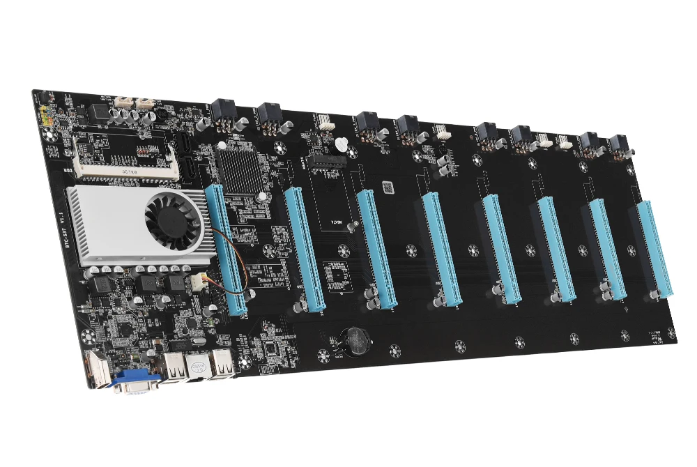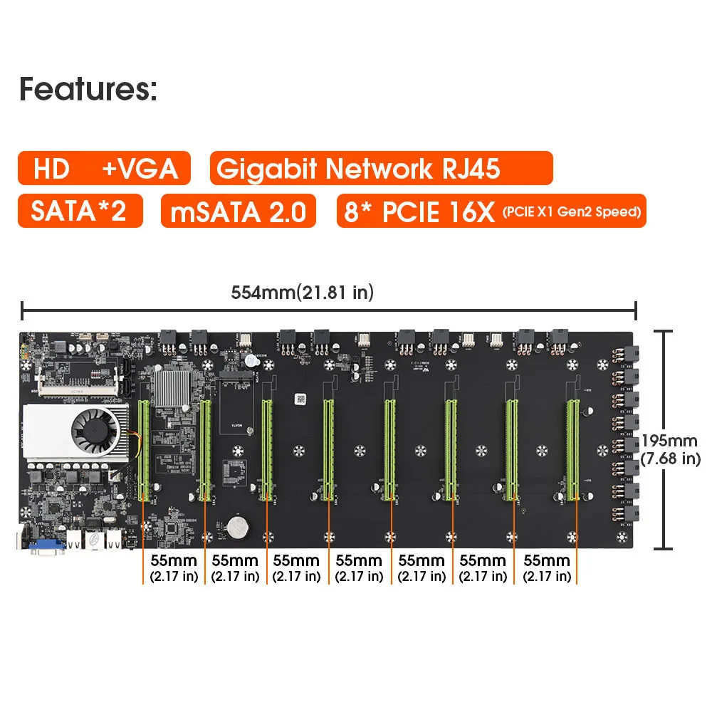 Особенности:1. Слот для памяти, 8 разъемов для видеокарты.2. Высокая производительность вычислений, на 10% выше, чем Материнские платы того же уровня.3. Оснащен Sodimm DDR3 слотом памяти, 16*6pin PCI-E X16 разъем питания, значительно повышает производительность материнской платы.4. Конденсатор стабилизации напряжения может обеспечить стабильное напряжение для вашего оборудования электропитания.5. Он может обеспечить тихую производительность, низкое энергопотребление, меньшее количество тепла, энергосбережение и безопасное использование.Модель: BTC-D37Память: 1 * DDR3 Sodimm слот, поддержка 1066/1333/1600 МГцХранение: 1 * SATA3.0 + 1 * SATA2.0 + 1 * m SATA2.0USB: 4 * USB2.0Сетевой порт: гигабитный сетевой порт RJ45Расширяемый порт: 8 * PCIE 16X,16*6pin PCIE X16 разъем питания, HD + VGAMSATA SSD:Емкость: 128 ГБРазмер: 50х30х3 ммТребования: DC3.3V / 1AПрименение: рабочий стол, ноутбук, сервер, точность добычиСостояние: абсолютно новый, различные брендыRAM:Чип: SEC / HY / MT или другое (отправлено случайным образом)Тип: без ECC, без REG (память ноутбука)Частота: DDR3 1600 МГц или DDR3L (отправлено случайным образом)Емкость: 4 ГБ DDR3 1600 МГцКабель питания:Калибр провода: 18 AWGДлина кабеля: 10,23 дюйма/250 мм8-pin женский конец используется для подключения к разъему питания источника питания.Два 8-pin (6 + 2) Мужской заканчивается подключаются к видеокарта и добыча материнская плата.Дружеское напоминание:Проверьте, полностью ли кабель совместим с вашим устройством. Если вы не уверены, пожалуйста, немедленно свяжитесь с нами перед оформлением заказа.Количество: 10 шт.Упаковочный лист:1 * материнская плата1*128 ГБ mSATA SSD1*4 ГБ/8 ГБ DDR3 RAM10*8pin кабель питания