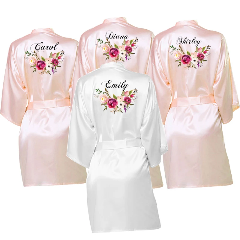 Свадебный Атласный халат, индивидуальное имя, цветочный принт