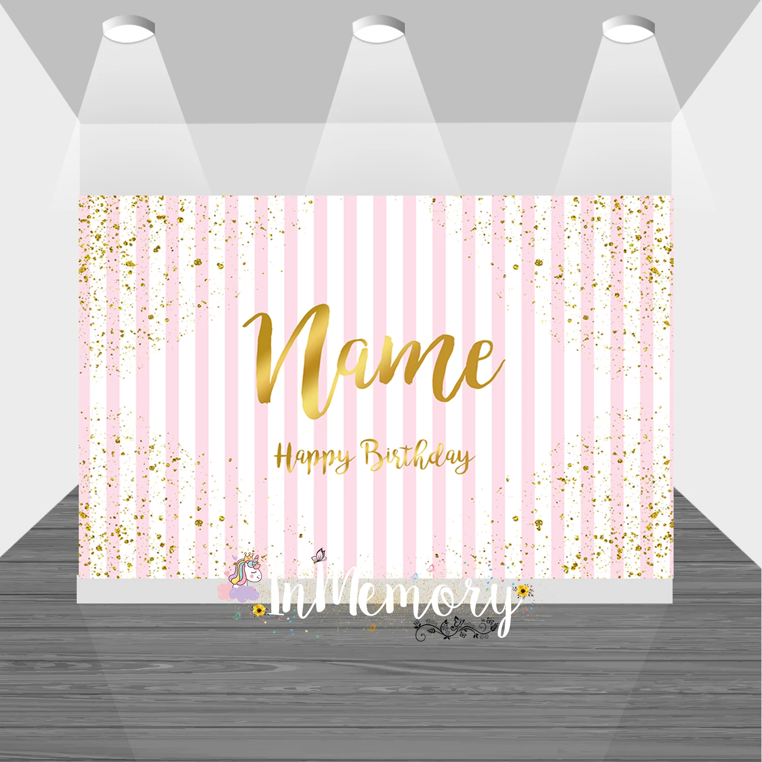 Виниловый фон для фотосъемки в розовые и белые полосы с золотыми боке и точками под заказ с именем на день рождения