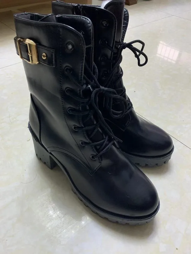 Новинка, женские зимние ботинки из искусственной кожи на высоком каблуке, зимние ботинки на толстом и бархатной подкладке, черные женские ботинки средней длины со шнуровкой и пряжкой