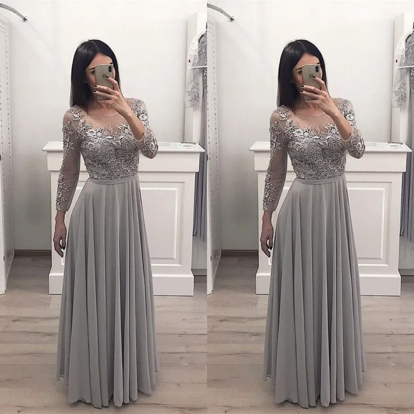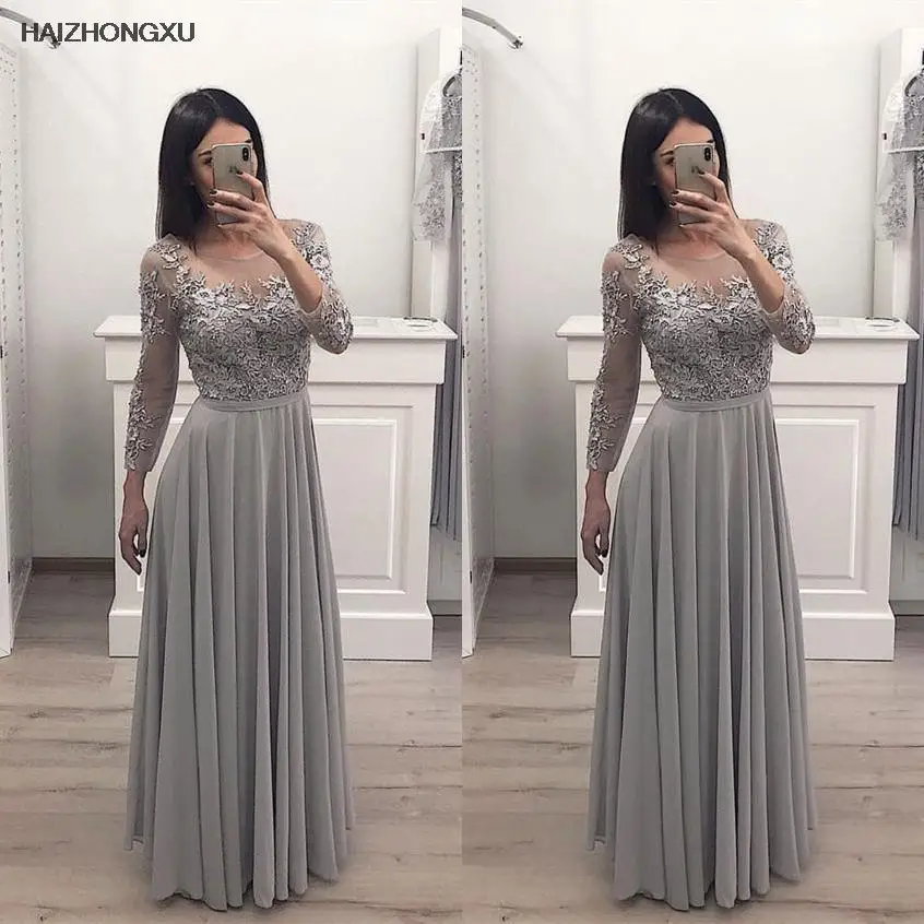Серебристо-серое кружевное шифоновое платье для матери невесты для свадебной вечеринки длинный рукав в пол