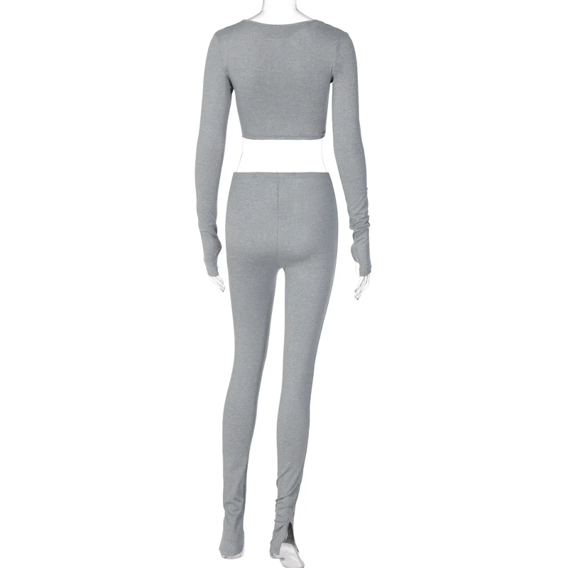 Женский спортивный костюм из топа и леггинсов, привлекательный укороченный Топ с длинным рукавом и V-образным вырезом, спортивная одежда для весны и осени, 2021