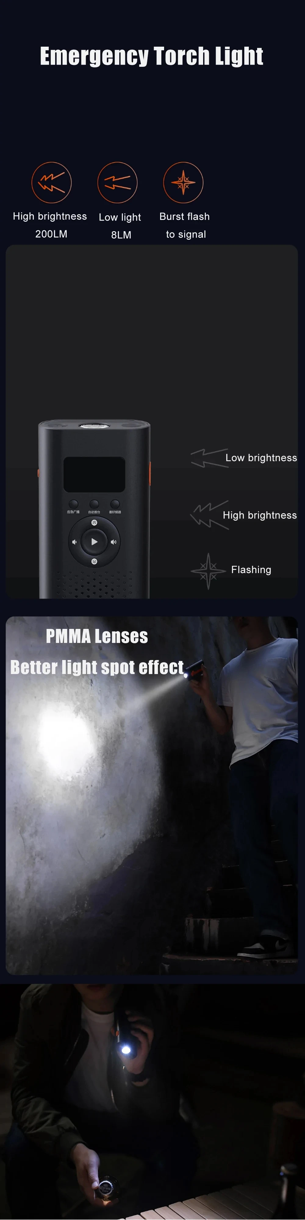 Радио: слегка нажмите на среднюю кнопку, чтобы включить радио, и ЖК-экран загорится. При включении ЖК-экрана снова нажмите среднюю кнопку, чтобы выключить радио. (Если фонарик и радио включены одновременно, сначала нужно выключить фонарик, затем нажмите среднюю кнопку, чтобы выключить радио)
