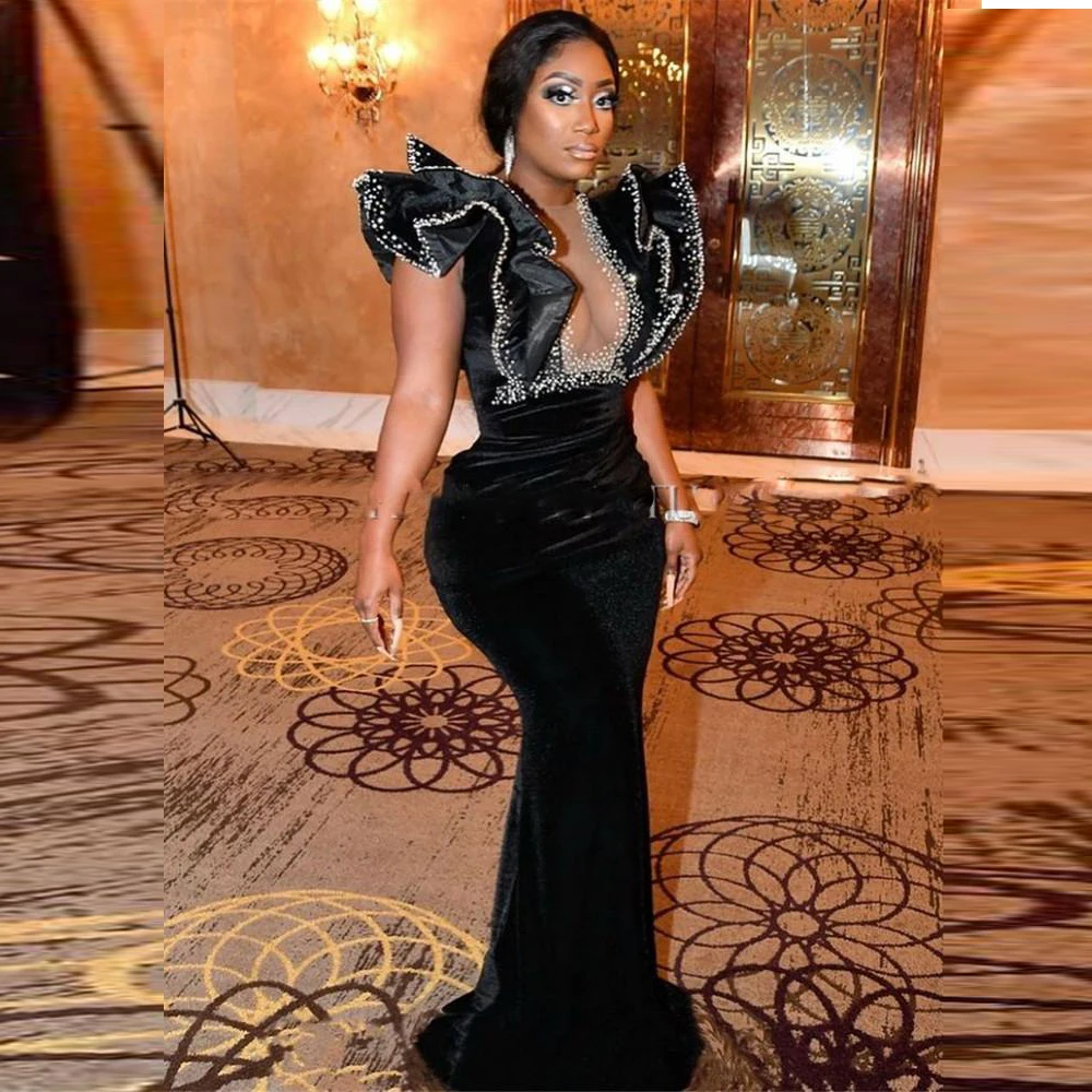 Роскошные велюровые вечерние платья, прозрачное длинное платье с бусинами и высоким воротом, плиссированное бархатное сексуальное платье для выпускного вечера