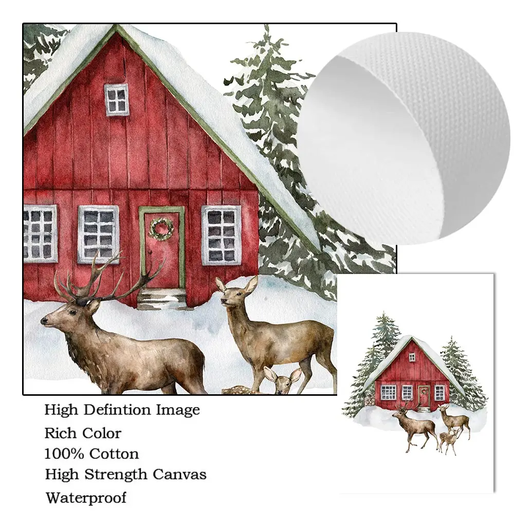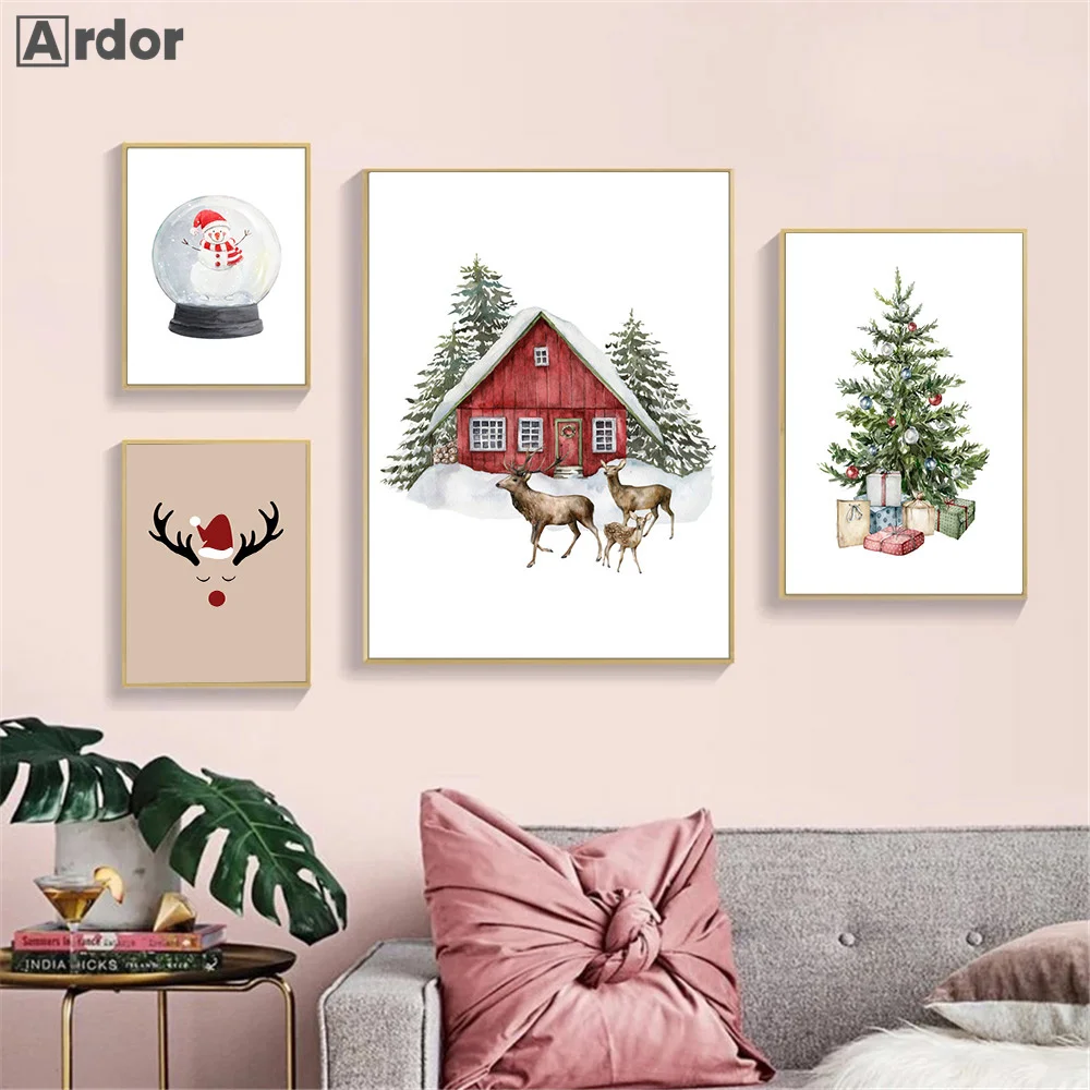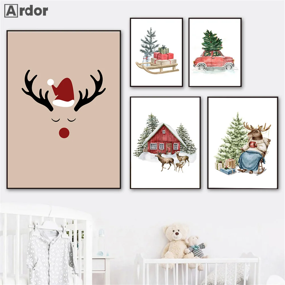 Рождественская елка, лось, дом, подарок, снежинка, настенная Картина на холсте, скандинавский постер и принты, настенные картины для автобуса, декор для детской комнаты и дома