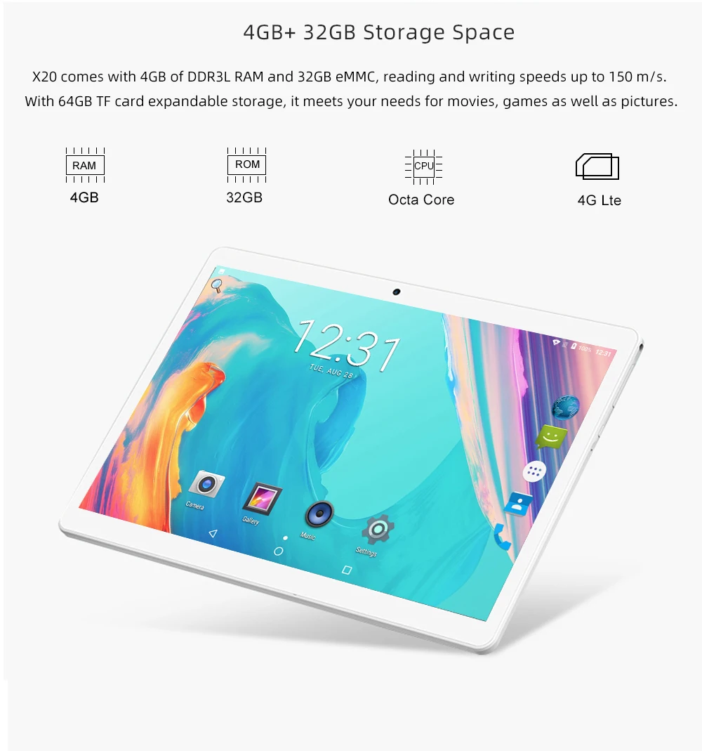 Планшетный ПК поставляется с 4 Гб оперативной памяти DDR3L и 32 Гб eMMC, скорость чтения и записи до 150 м/с. С расширяемой картой памяти TF 64 ГБ, она отвечает вашим потребностям в фильмах, играх, а также изображениях.
