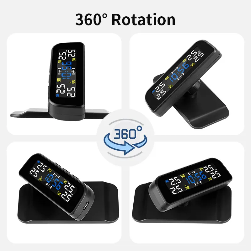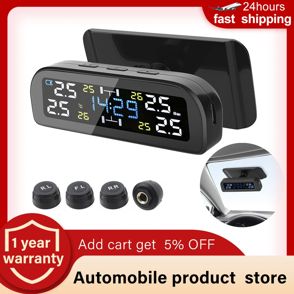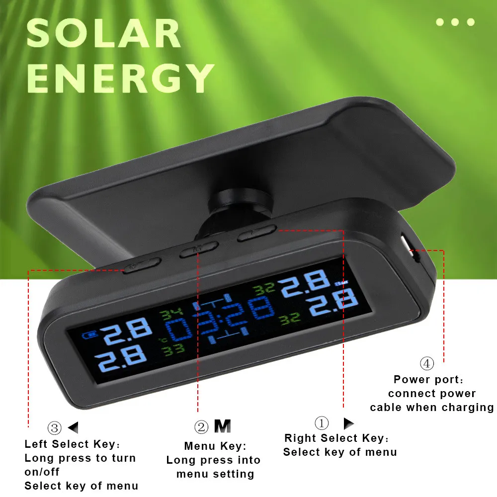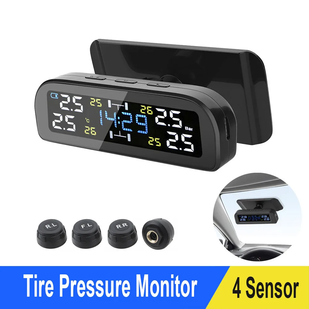 Беспроводная система контроля давления в шинах TPMS, цифровые часы на солнечной энергии, ЖК-дисплей, 4 внешних датчика давления в шинах