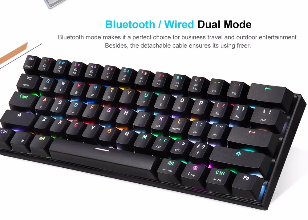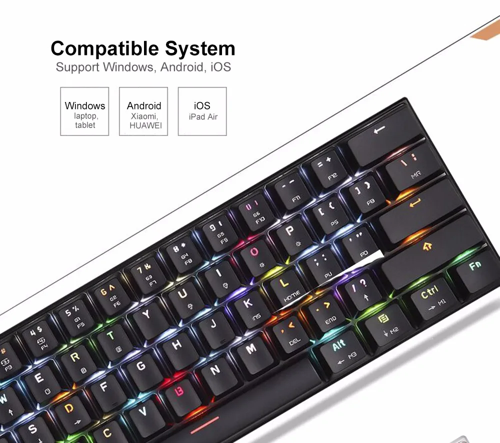 Спецификация:1. Бренд: Motospeed2. Модель: CK623. Подключение: bluetooth 3,0 и USB-C Проводной Двойной режим4. Подсветка: RGB и чисто белая подсветка5. Переключатель: Синий переключатель Outemu, красный переключатель6. Анти-ореолы номер: NKRO7. Номер ключа: 61 Ключ 60% макет8. Ток: 5V - 300mA (проводном режиме), 3,7 V - 200mA (Включите bluetooth-режим)9. Источник питания: Встроенный литий-ионный аккумулятор 1300 мАч10. Время зарядки: 3 - 4 часа11. Время работы в режиме ожидания: 480 часов12. Время работы: 10 часов13. Поддержка системы: Android, для iOS, Windows14. Диапазон беспроводной передачи: 10 м15. Срок службы клавиатуры (раз): 50 миллионов раз16. Ответ Скорость: 0,1 мс17. Размер продукта (Д x Ш x В): 29,00x10,00x4,00 см/11,42x3,94x1,57 дюймов18. Вес изделия: 490 г19. Кабель Длина (м): 1,5 мОсобенности:1. Поддерживает bluetooth и проводное двухрежимное соединение, подходит для деловых поездок или развлечений на открытом воздухе.Длительное нажатиеРежим "Fn" +"Ключ может переключить режим подключения.Желтый светильник мигает три раза, затем превращается в зеленый, клавиатура входит в проводной режим.Фиолетовый светильник мигает три раза, затем становится синим, он переходит в режим bluetooth.2. Как подключить устройство в режиме bluetoothВ первую очередь: Включите переключатель питания bluetooth на задней панели.Второй: Короткое нажатие Fn + E / R / T для сопряжения с устройствами bluetooth.Третий: Удерживайте Fn + Q в течение 3-5 с, чтобы войти в состояние сопряжения, мигает синий светильник Под клавишей Caps; Выполните поиск сигнала клавиатуры на вашем bluetooth-устройстве и выберите для подключения. Синий светильник выгорит при удачном подключении.3. Несколько режимов подсветки для опции.Нажмите клавишу Fn + меню, чтобы переключить режимы подсветки, нажмите Fn + правую клавишу Ctrl, чтобы включить цвета baclit.Нажмите клавишу Fn + O / P, чтобы настроить скорость отображения, и нажмите Fn + U / I, чтобы настроить яркость подсветки.4. Режим перекодирования для большего количества функций. ПрессFn + 1 / 2 / 3 / 4Для реализации функции транскодирования около 3 с светится Розовый индикатор-светильник.Удерживайте Fn + 1 до тех пор, пока не загорится розовый светильник под 1 клавишей, «1, 2, 3, 4, 5, 6, 7, 8, 9, 0, -, = "можно изменить на" F1 - F12 ".Удерживайте Fn + 2 до тех пор, пока не загорится розовый светильник под 2 клавишами, "[{, "]}, :, ", K,<, L, .> «Ключ может быть изменен на «PS, PB, PG, PD, INS, Del, HOME, END» функциональную клавишу.Удерживайте Fn + 3, пока не загорится розовый светильник под 3 клавишами, «/, правый Alt, меню, правый Ctrl» можно изменить на клавиши со стрелками.Нажмите Fn + 4, пока не загорится розовый светильник с 4 клавишами, кнопка «WASD» также может переключаться на клавиши со стрелками.Посылка включает в себя:1 * Клавиатура1 * кабель Type-C1 * руководство на английском/китайском языках